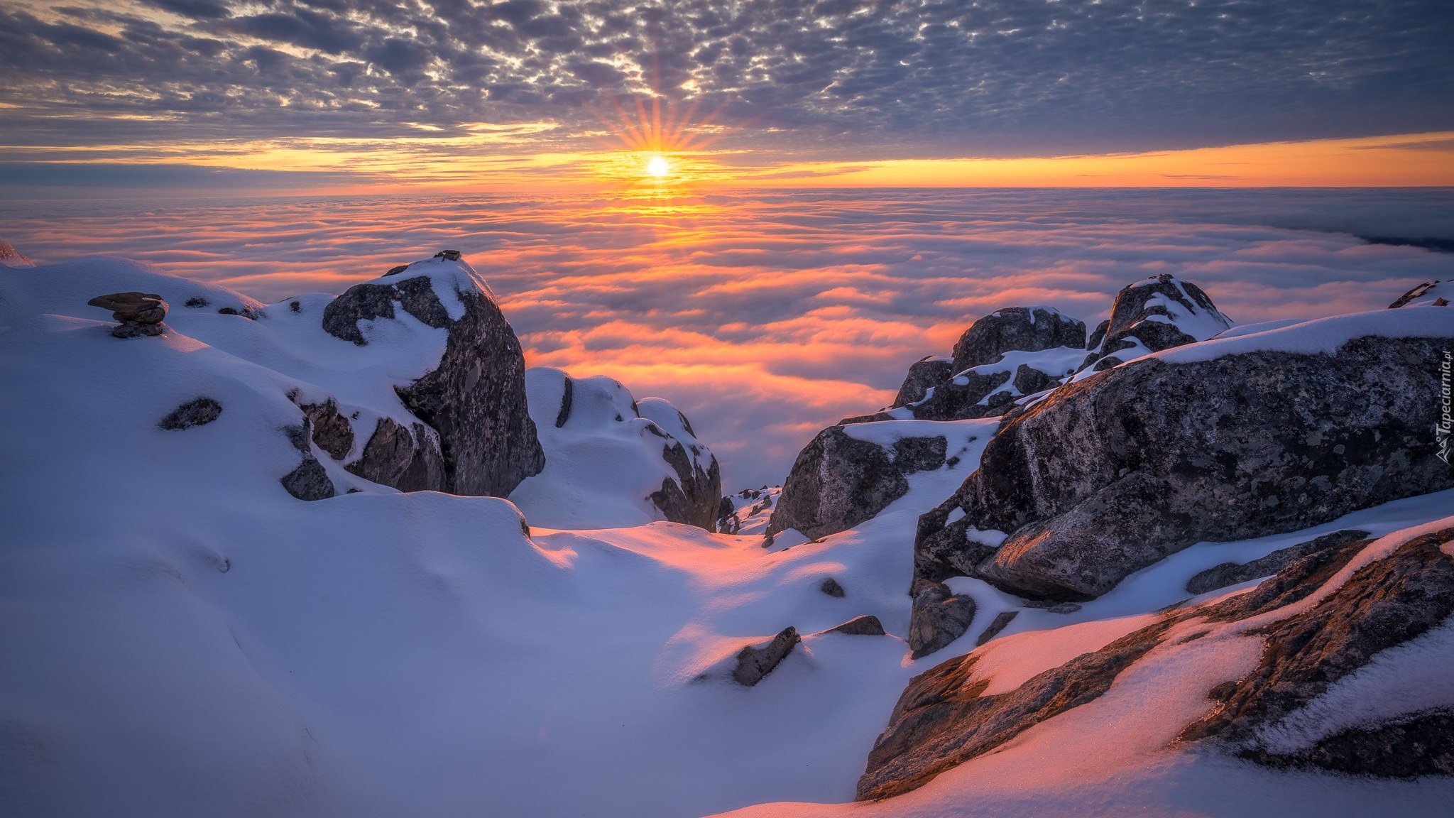 Edytor tapety: Skały w śniegu i zachód słońca nad chmurami