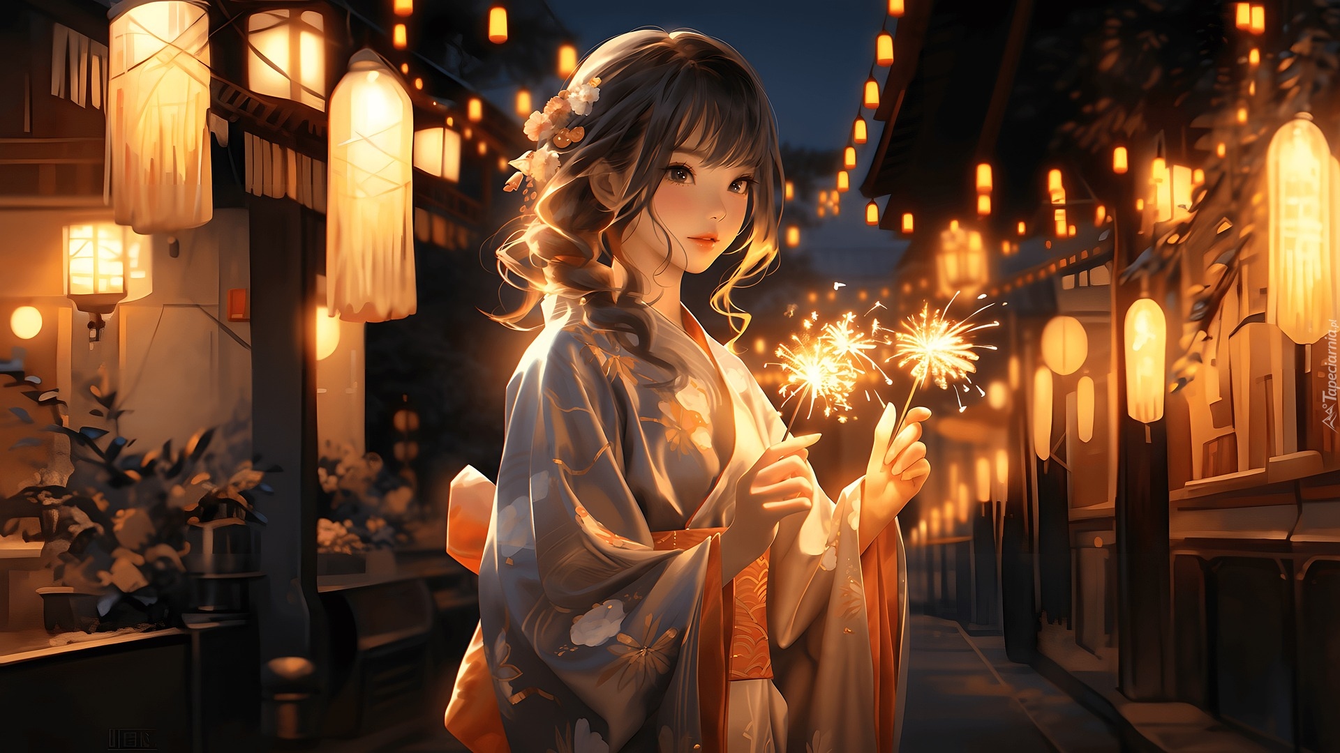 Edytor tapety: Dziewczyna w kimono ze sztucznymi ogniami