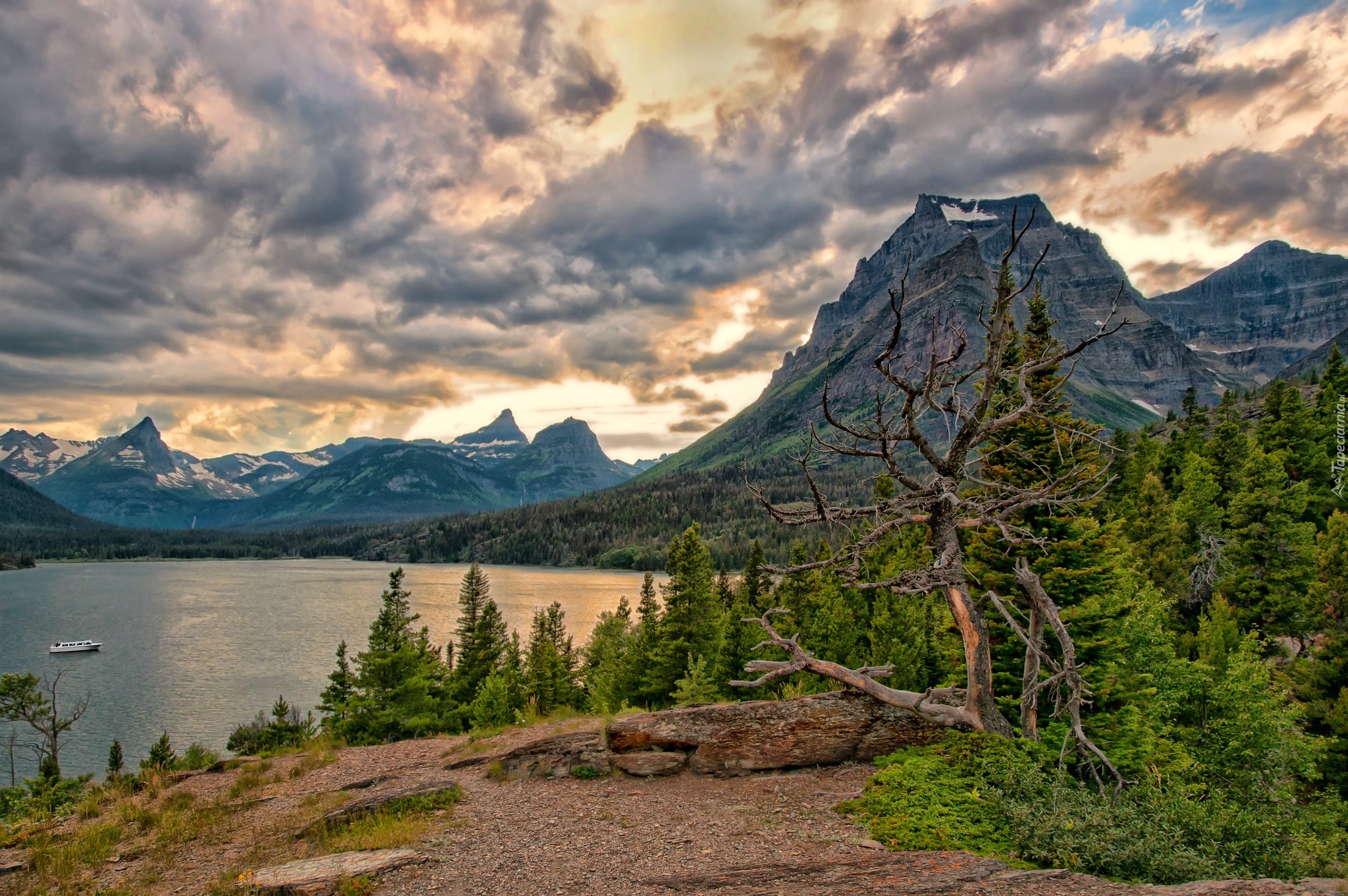 Edytor tapety: Ciemne obłoki nad górami i jeziorem