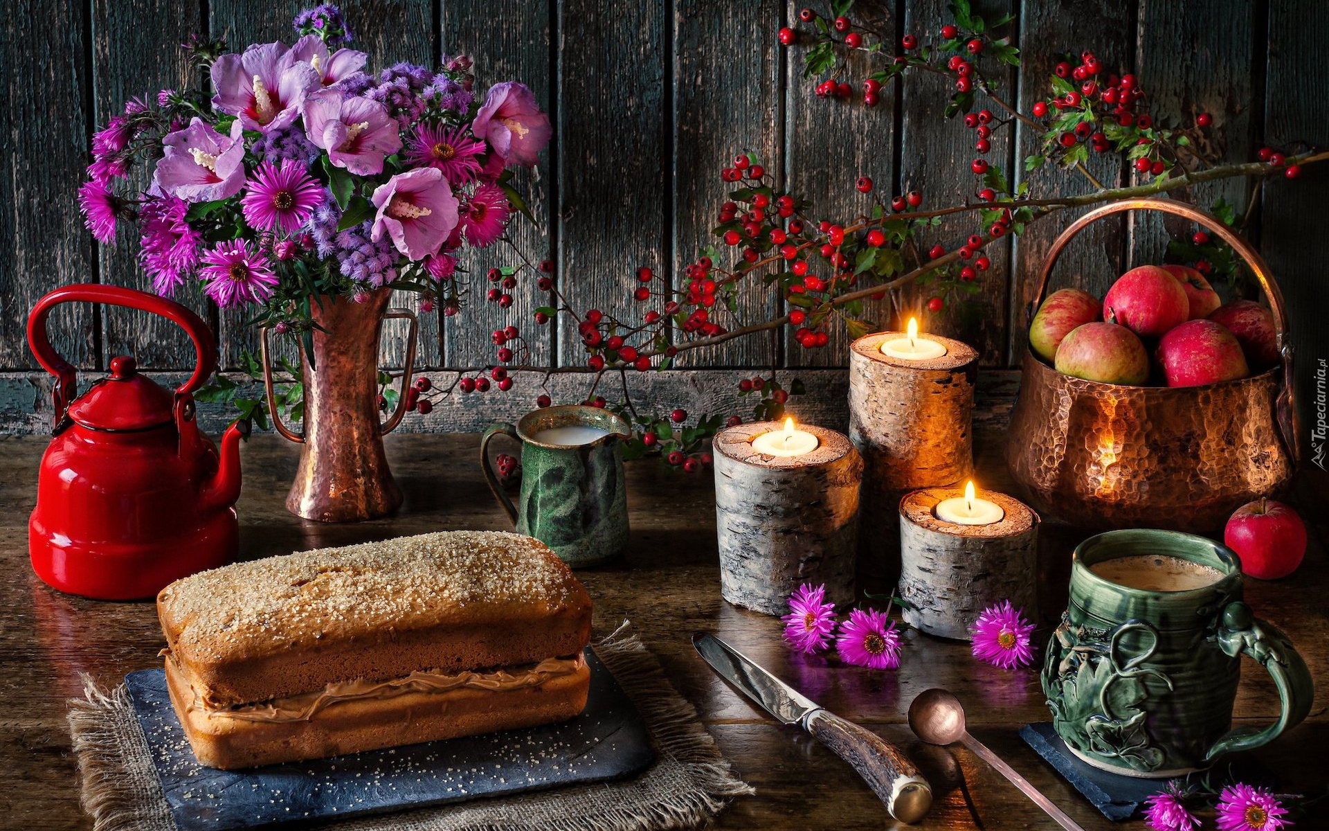 Edytor tapety: Czajnik obok ciasta i kwiatów w wazonie