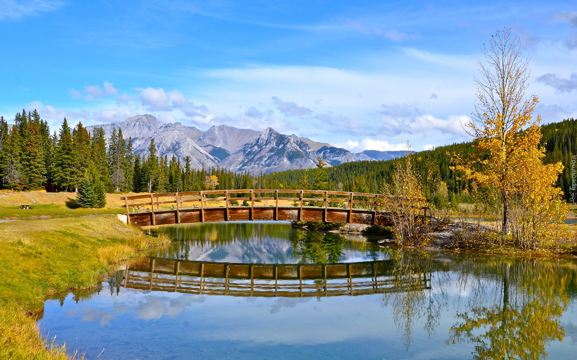 Edytor tapety: Mostek nad jeziorem i góry w oddali