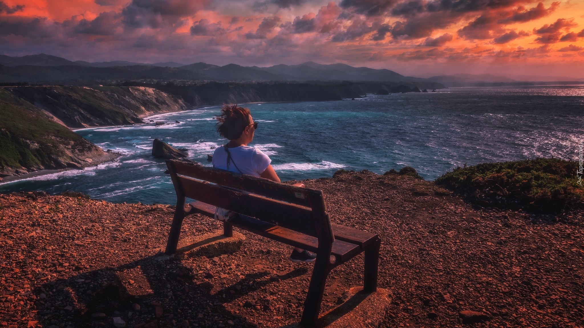 Edytor tapety: Kobieta na ławce nad morzem o zachodzie słońca