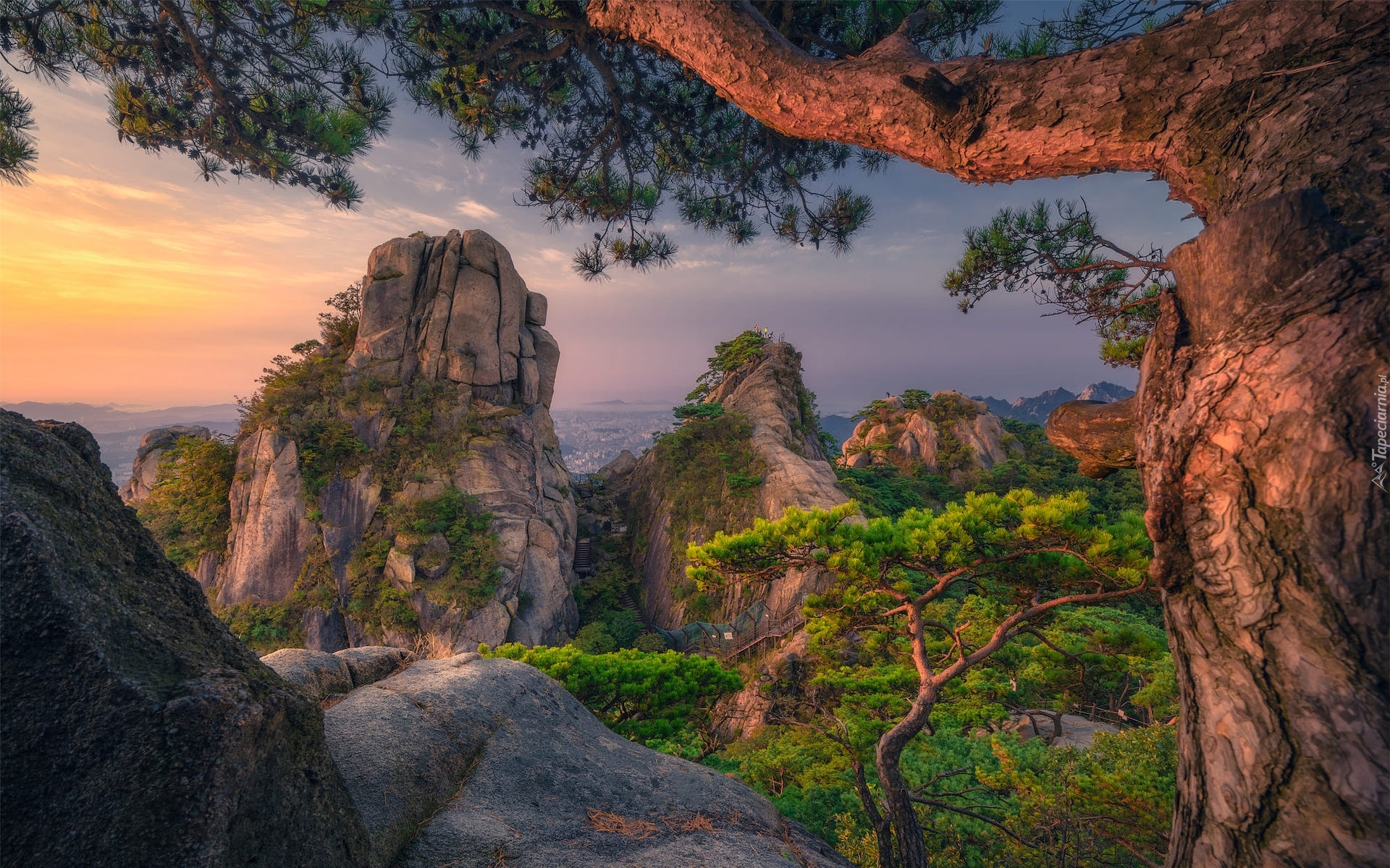 Edytor tapety: Rozświetlone skały i sosny w górach