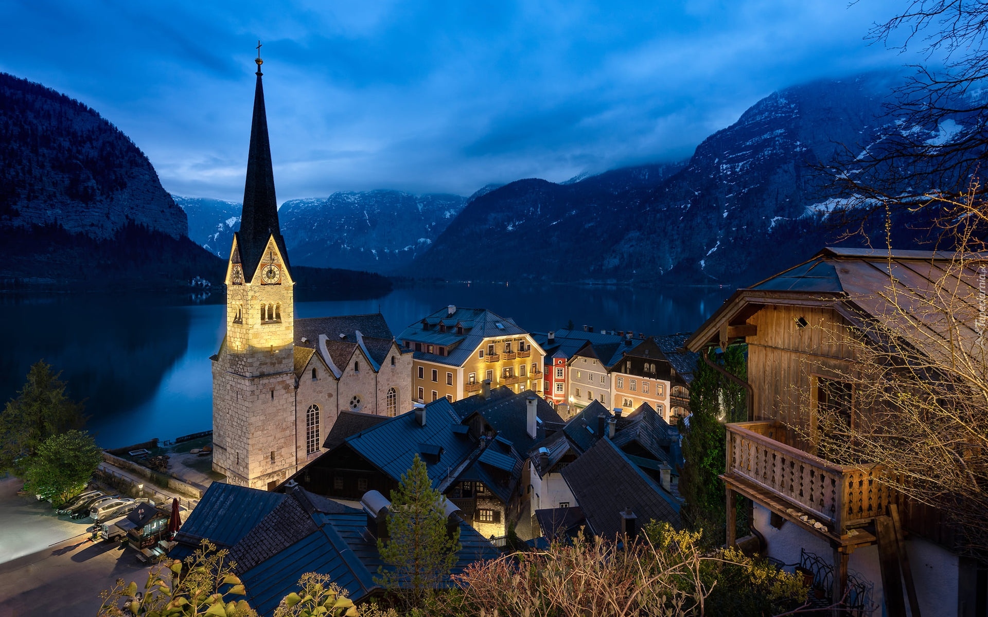 Edytor tapety: Oświetlony kościół w miasteczku Hallstatt