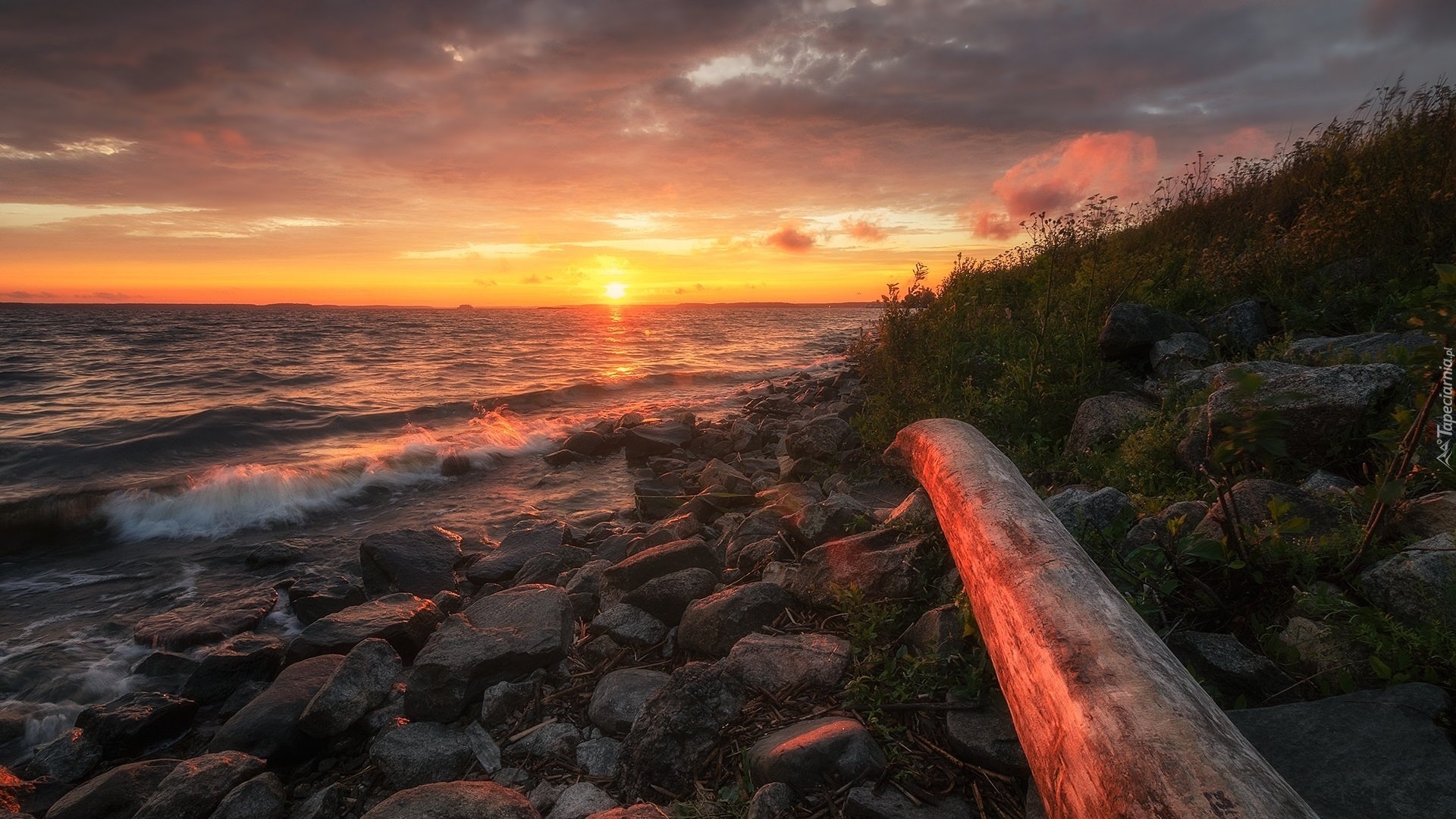 Edytor tapety: Kamienisty brzeg morza oświetlonego zachodem słońca