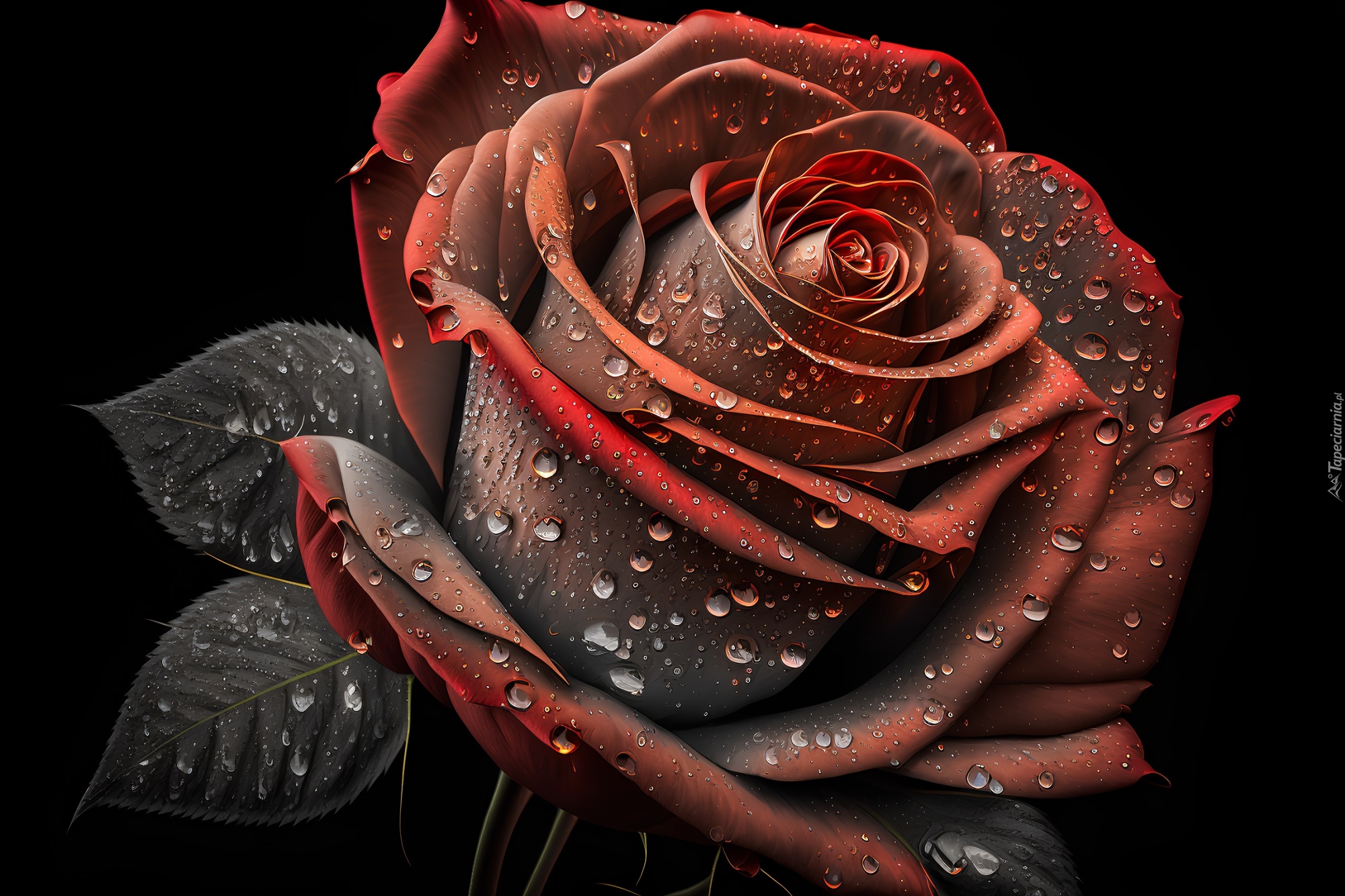 Edytor tapety: Czerwona róża z kroplami w grafice
