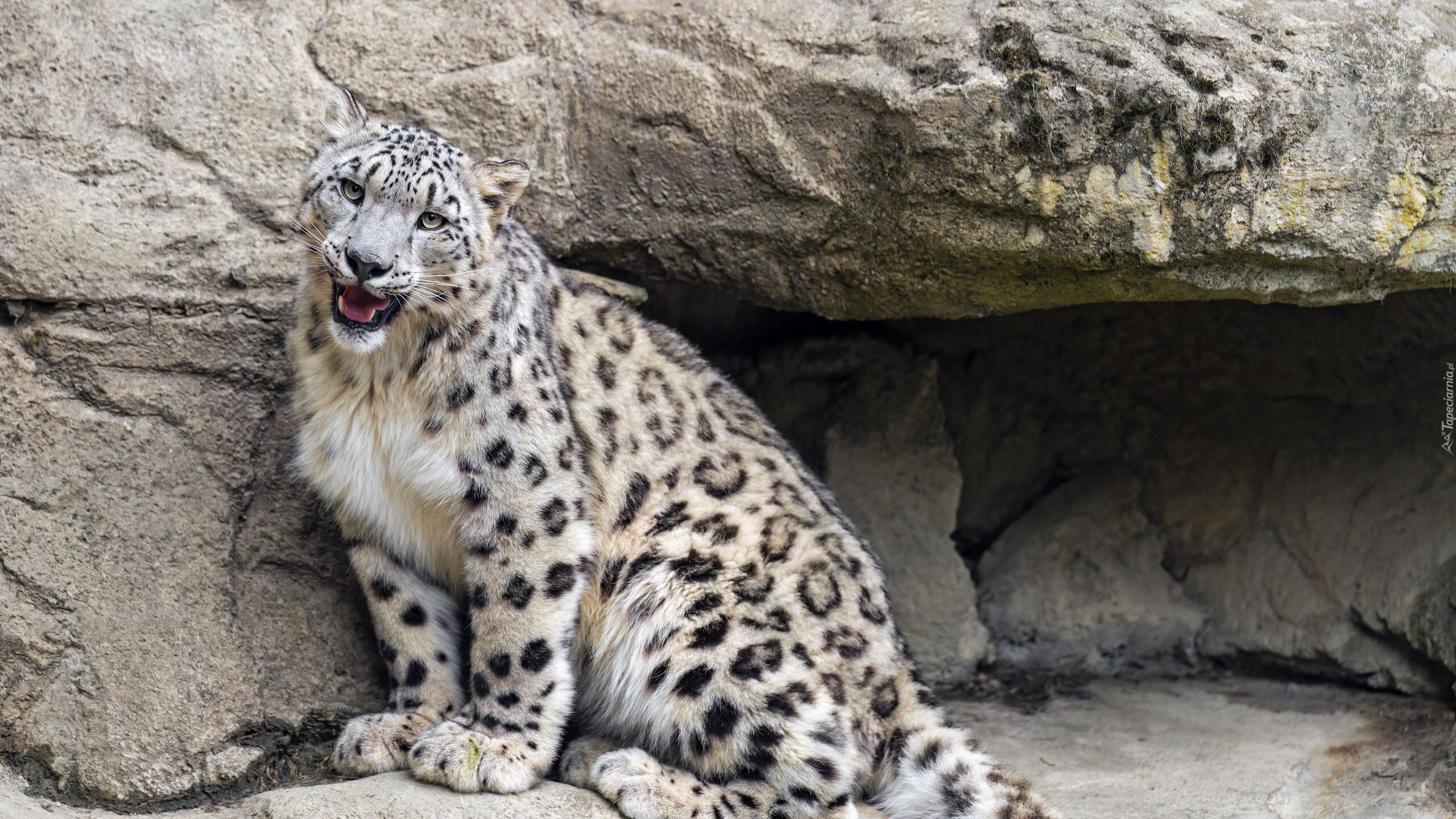 Edytor tapety: Irbis siedzący przy skale