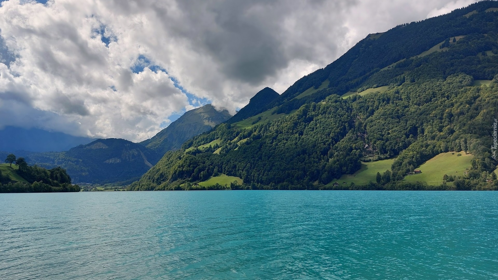 Edytor tapety: Zalesione góry nad jeziorem Lungern w Szwajcarii