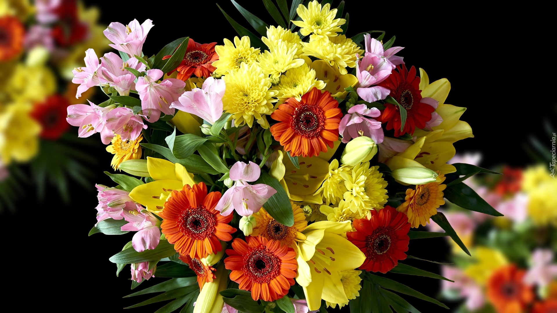 Edytor tapety: Bukiet z kolorowych kwiatów na czarnym tle