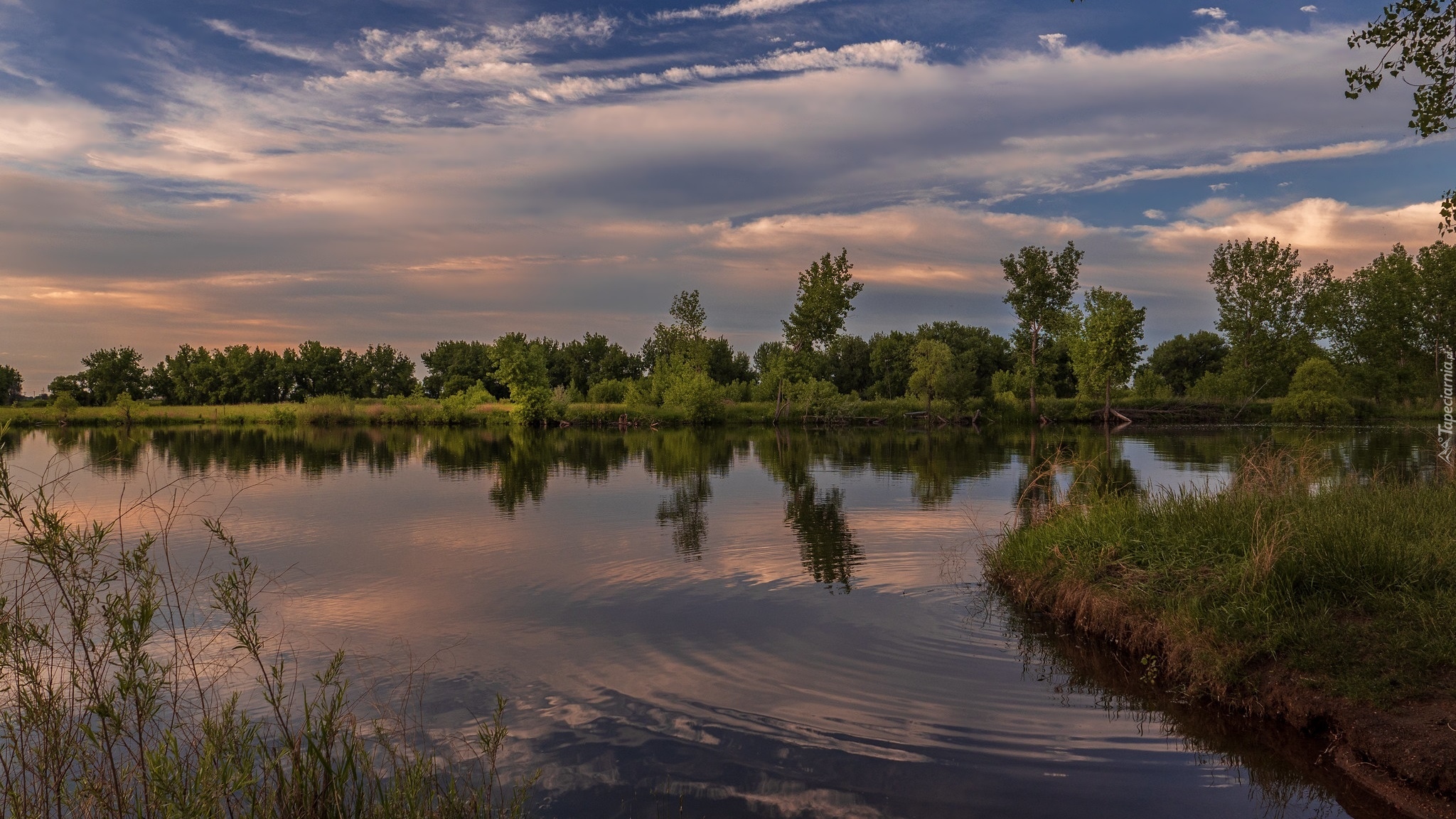 Edytor tapety: Zielone drzewa i trawa nad jeziorem