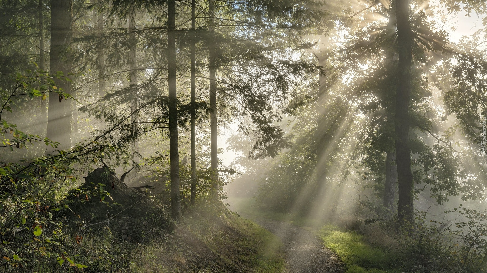 Edytor tapety: Smugi słonecznego światła wśród drzew w zamglonym lesie