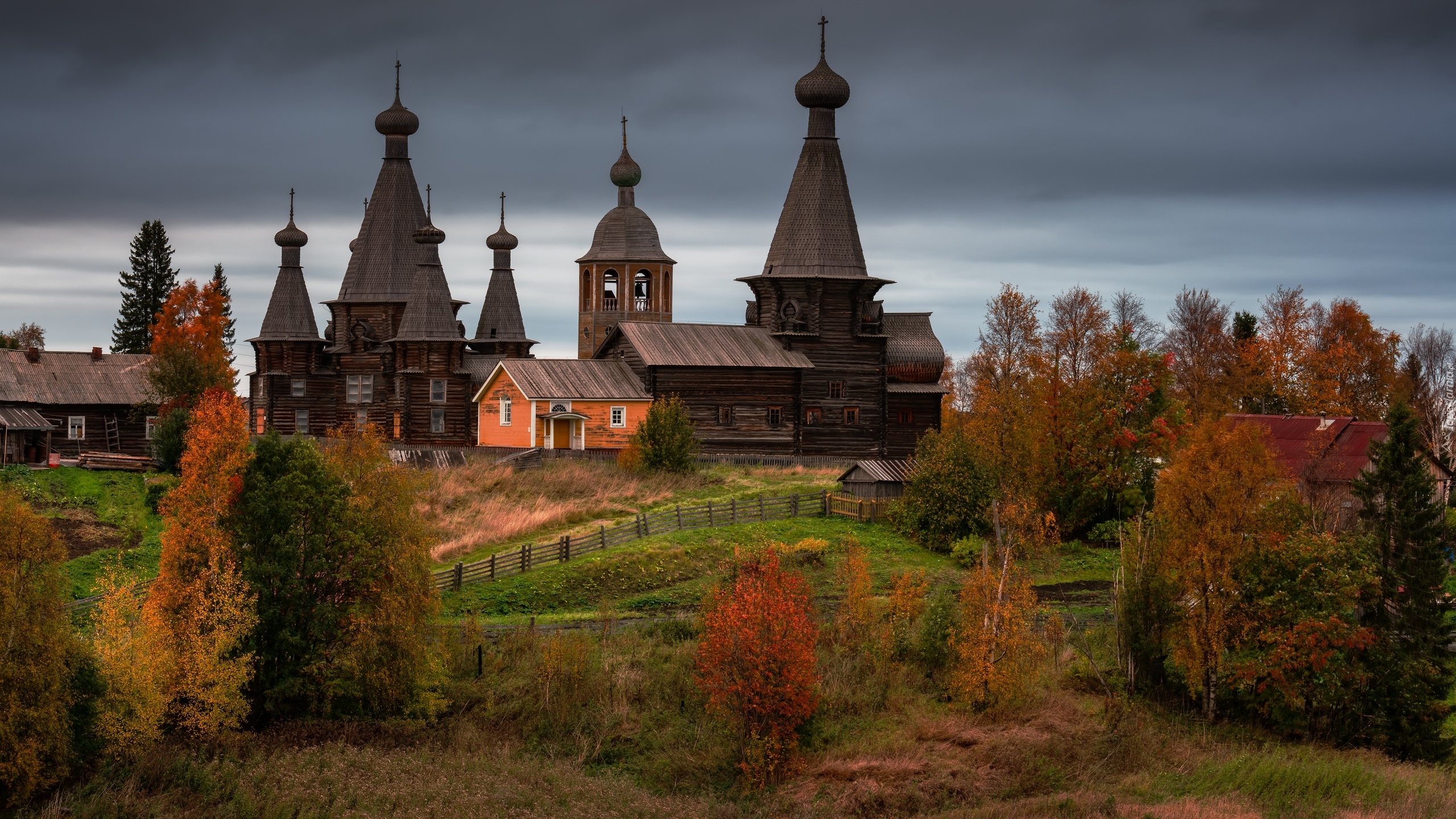 Edytor tapety: Cerkiew i domy we wsi Nenoksa jesienią