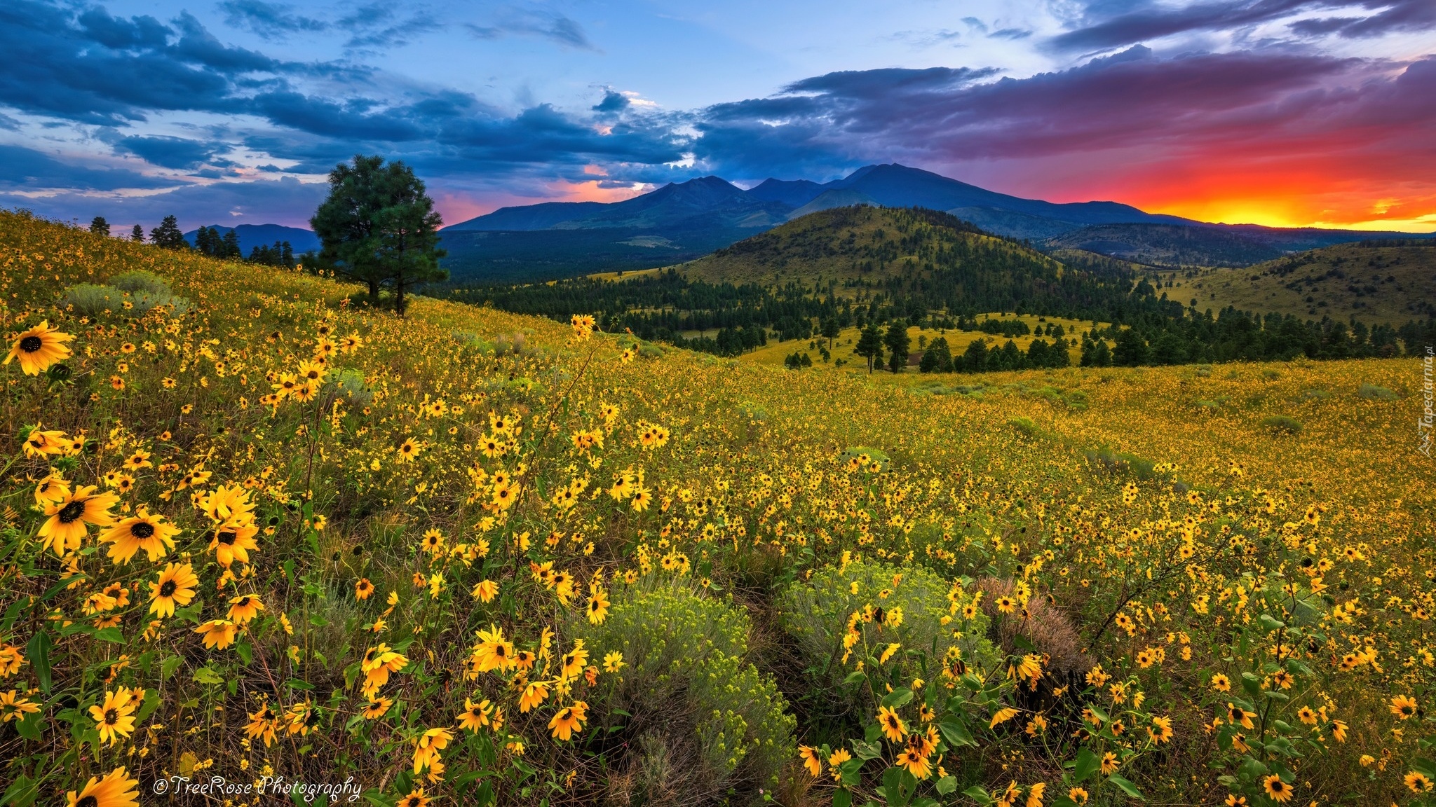 Edytor tapety: Żółte kwiaty na łące i góry w tle