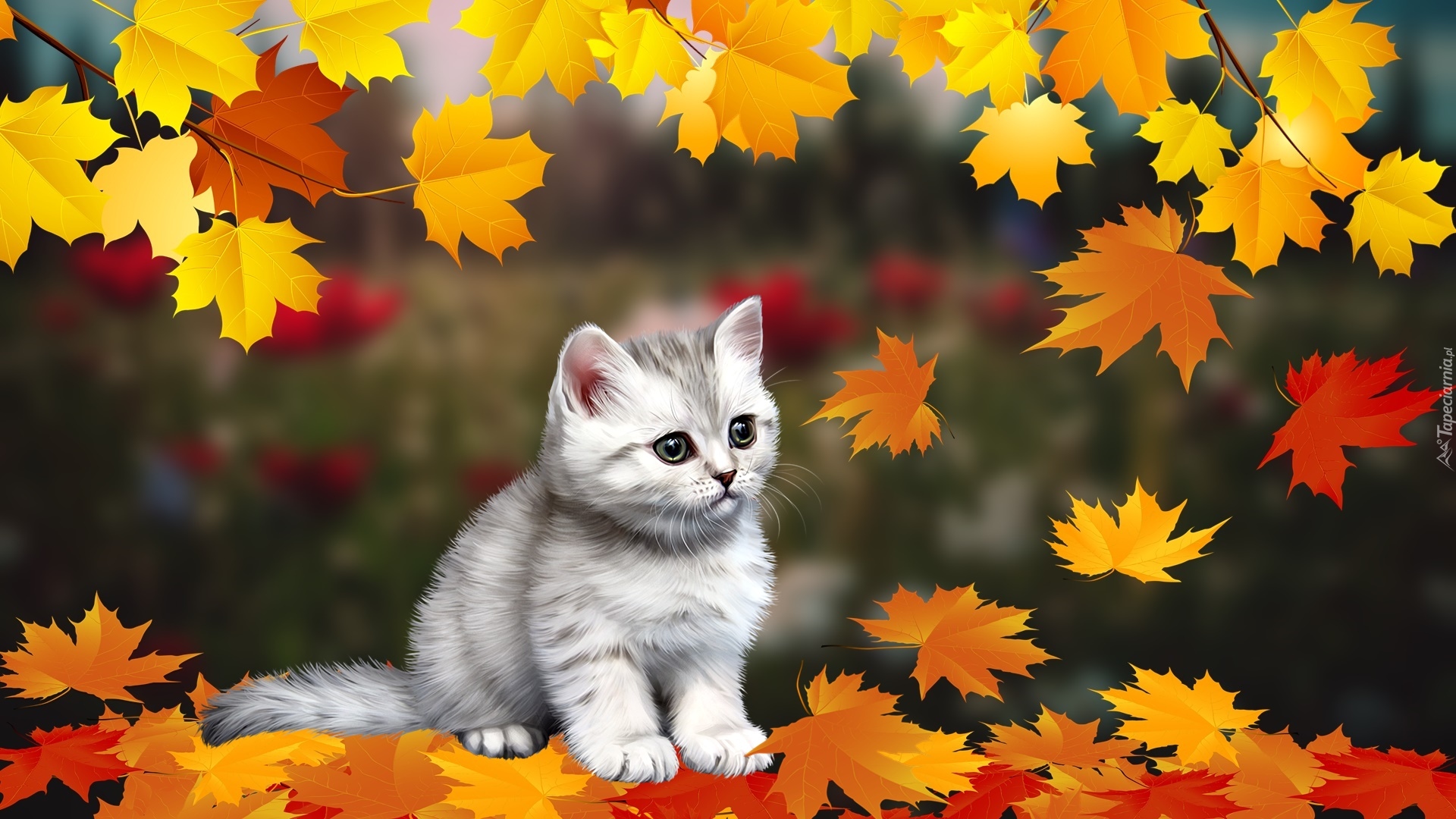 Edytor tapety: Mały kotek wśród jesiennych liści w grafice