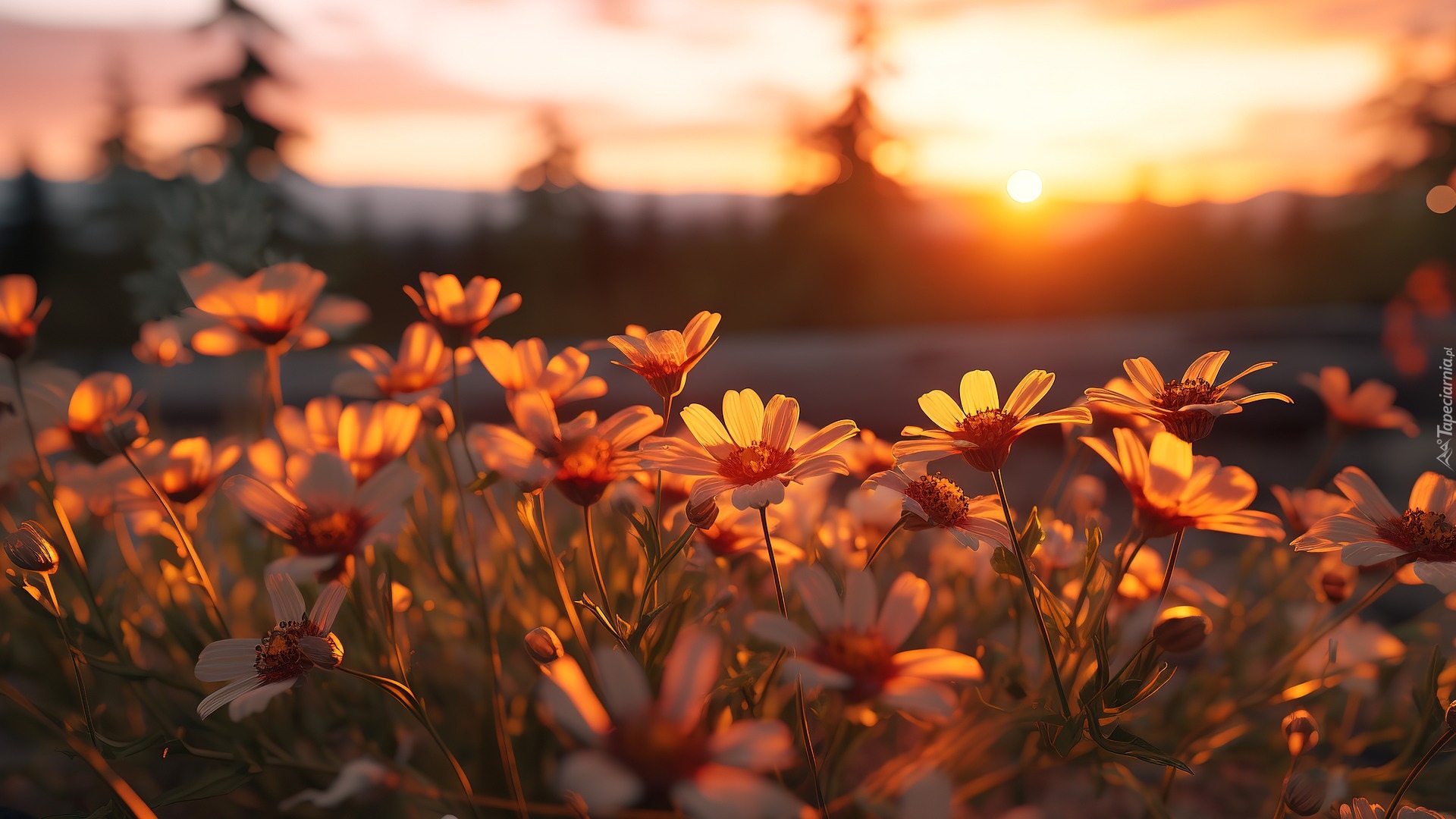 Edytor tapety: Kwiaty na łące w blasku zachodzącego słońca