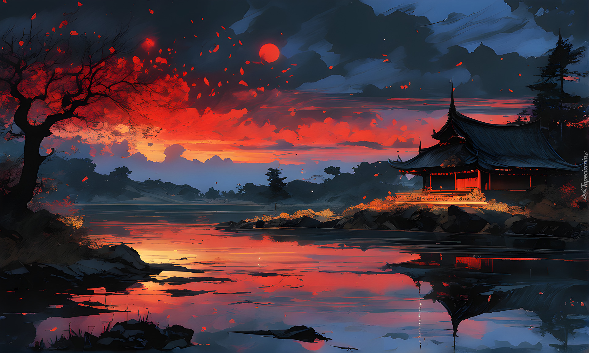 Edytor tapety: Kolorowe niebo nad domem i rzeką w grafice