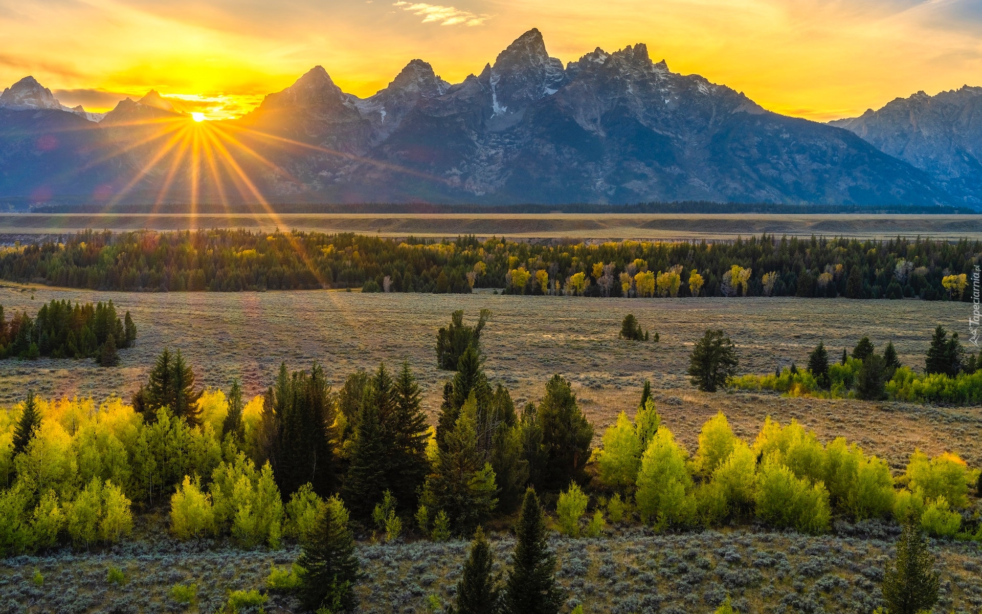 Edytor tapety: Promienie zachodzącego słońca nad górami Grand Teton