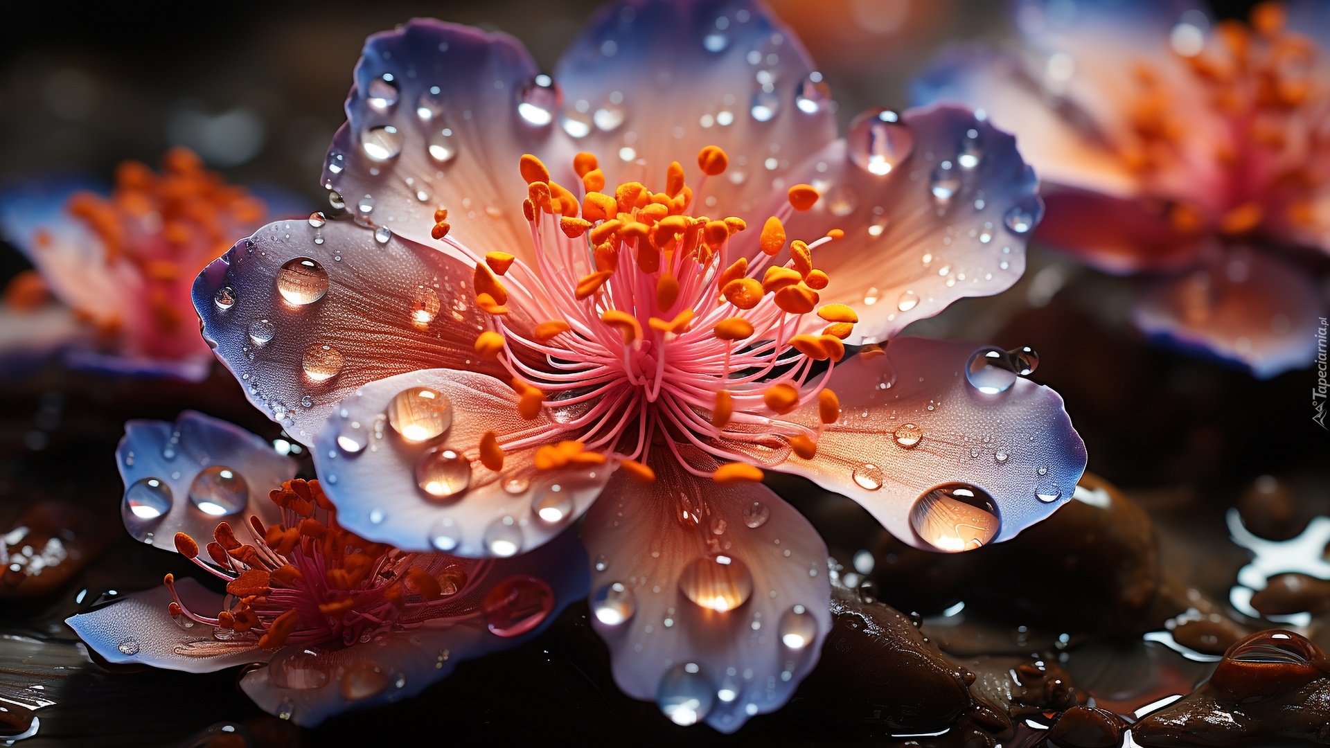 Edytor tapety: Krople wody na kwiatku w grafice
