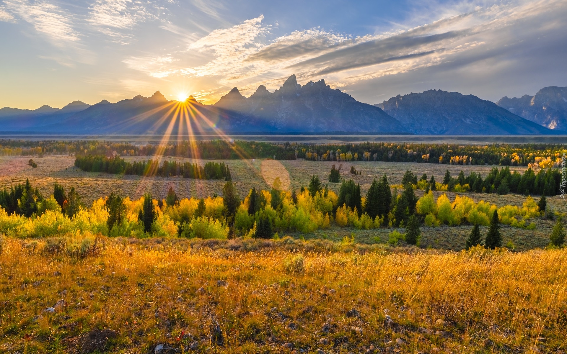 Edytor tapety: Promienie słońca nad górami Grand Teton