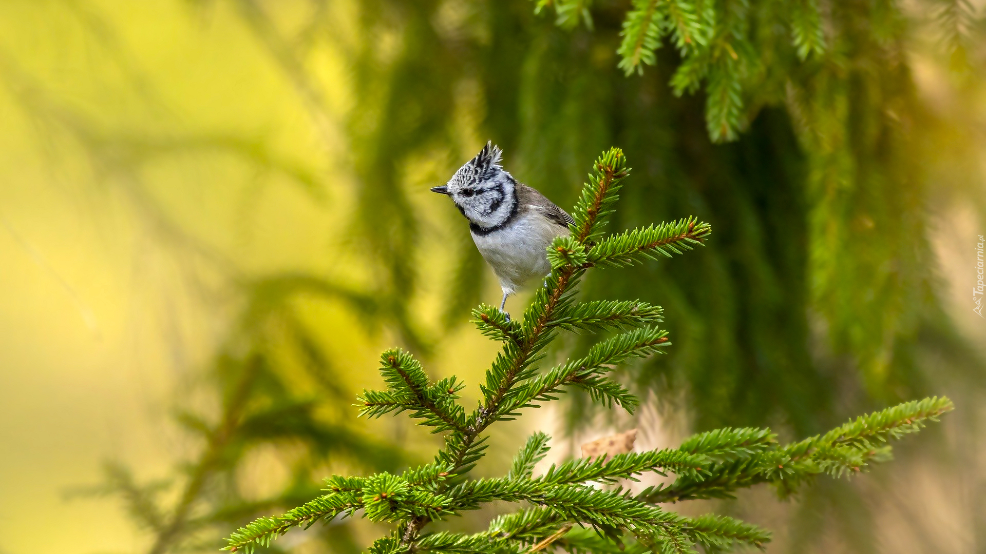 Edytor tapety: Czubatka na gałązce świerkowej