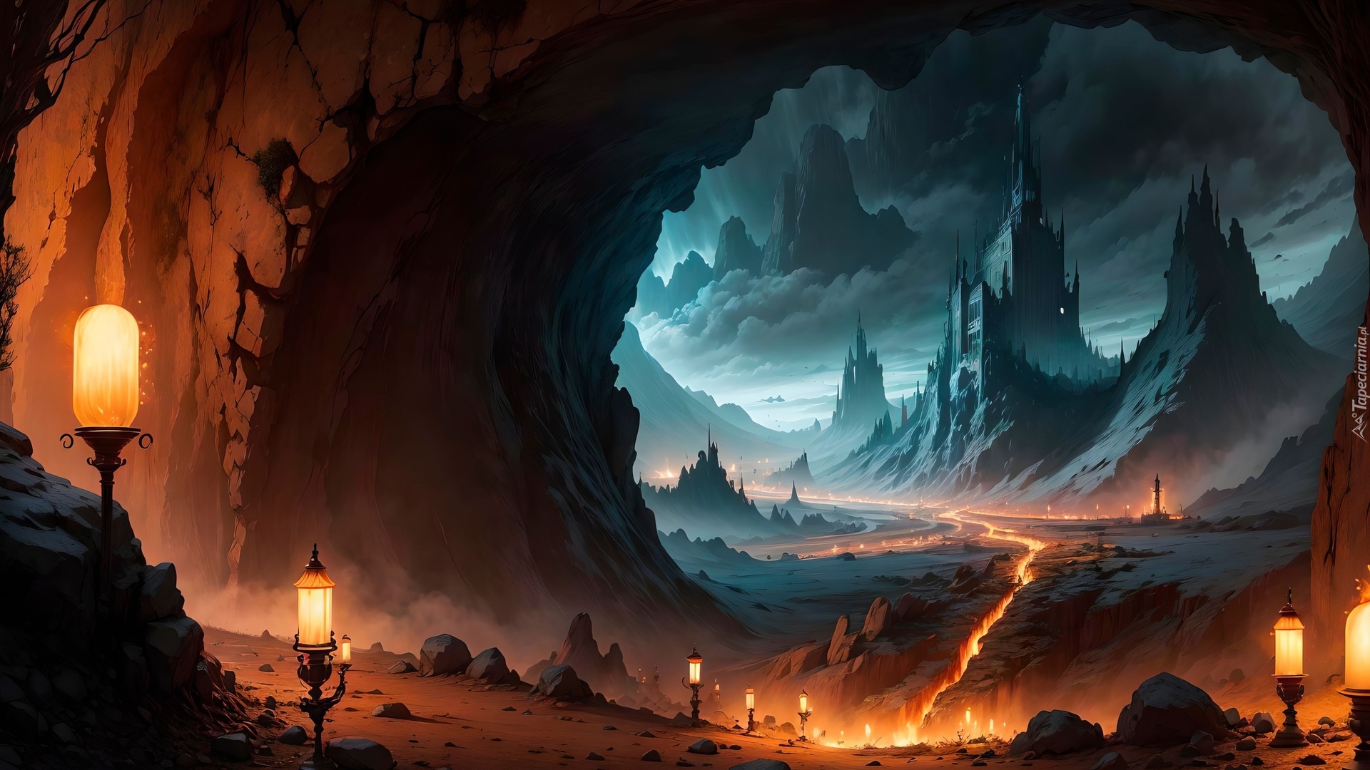 Edytor tapety: Widok na zamek z oświetlonej jaskini