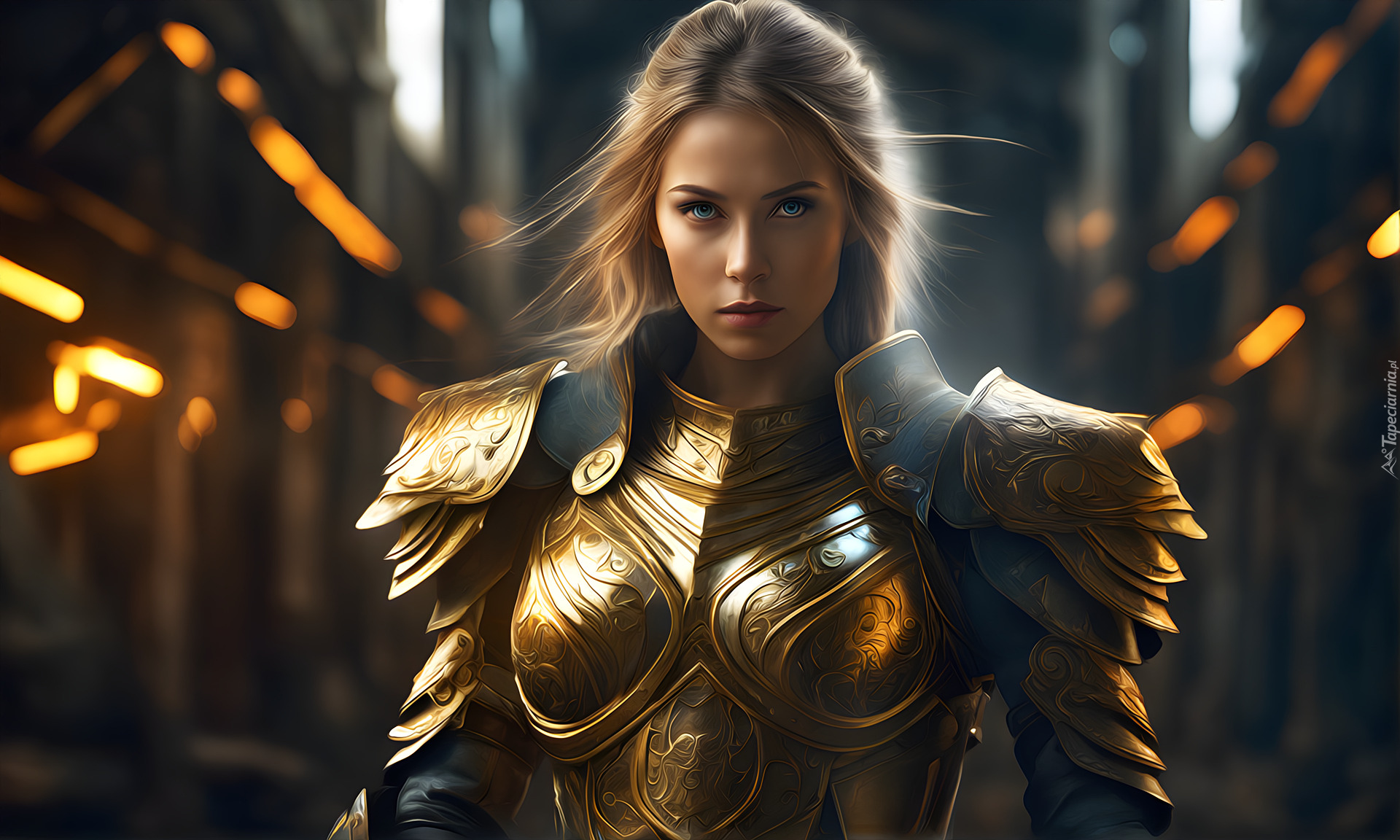 Edytor tapety: Niebieskooka kobieta w złotej zbroi