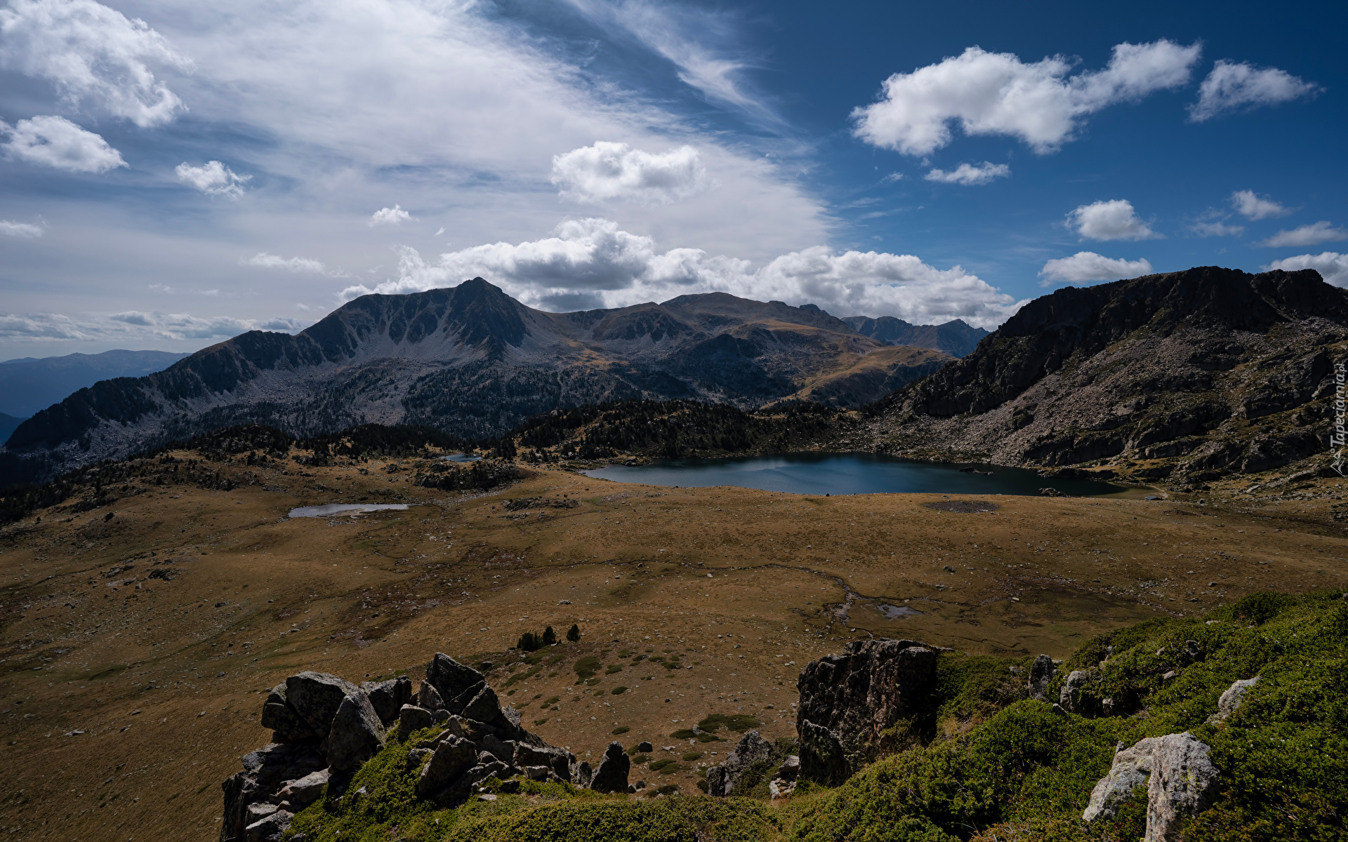 Edytor tapety: Widok na górskie jezioro i białe chmury