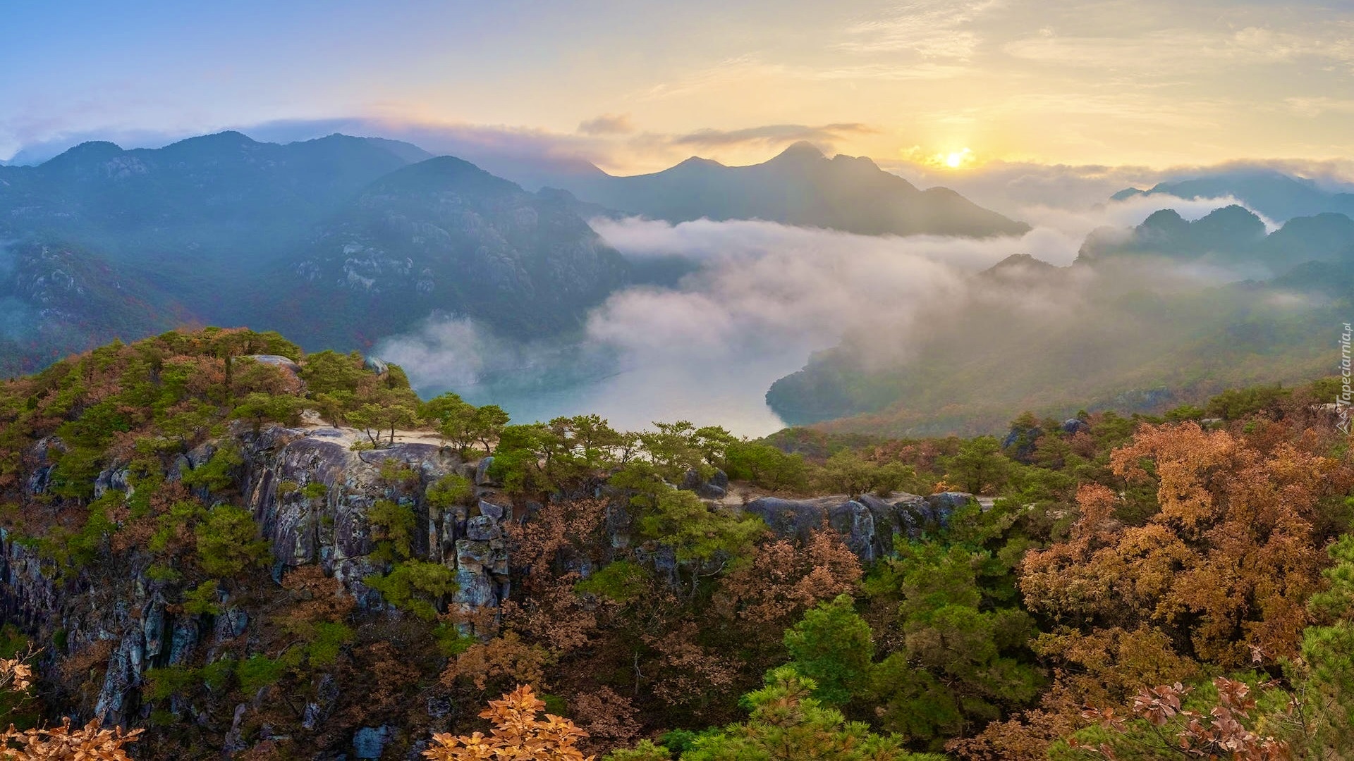 Edytor tapety: Zamglone góry Oksunbong w Korei Południowej