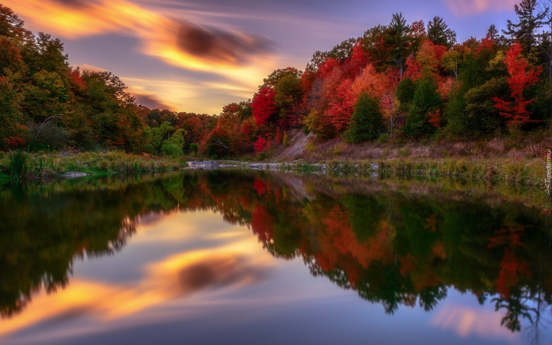 Edytor tapety: Odbicie kolorowych jesiennych drzew i nieba w jeziorze