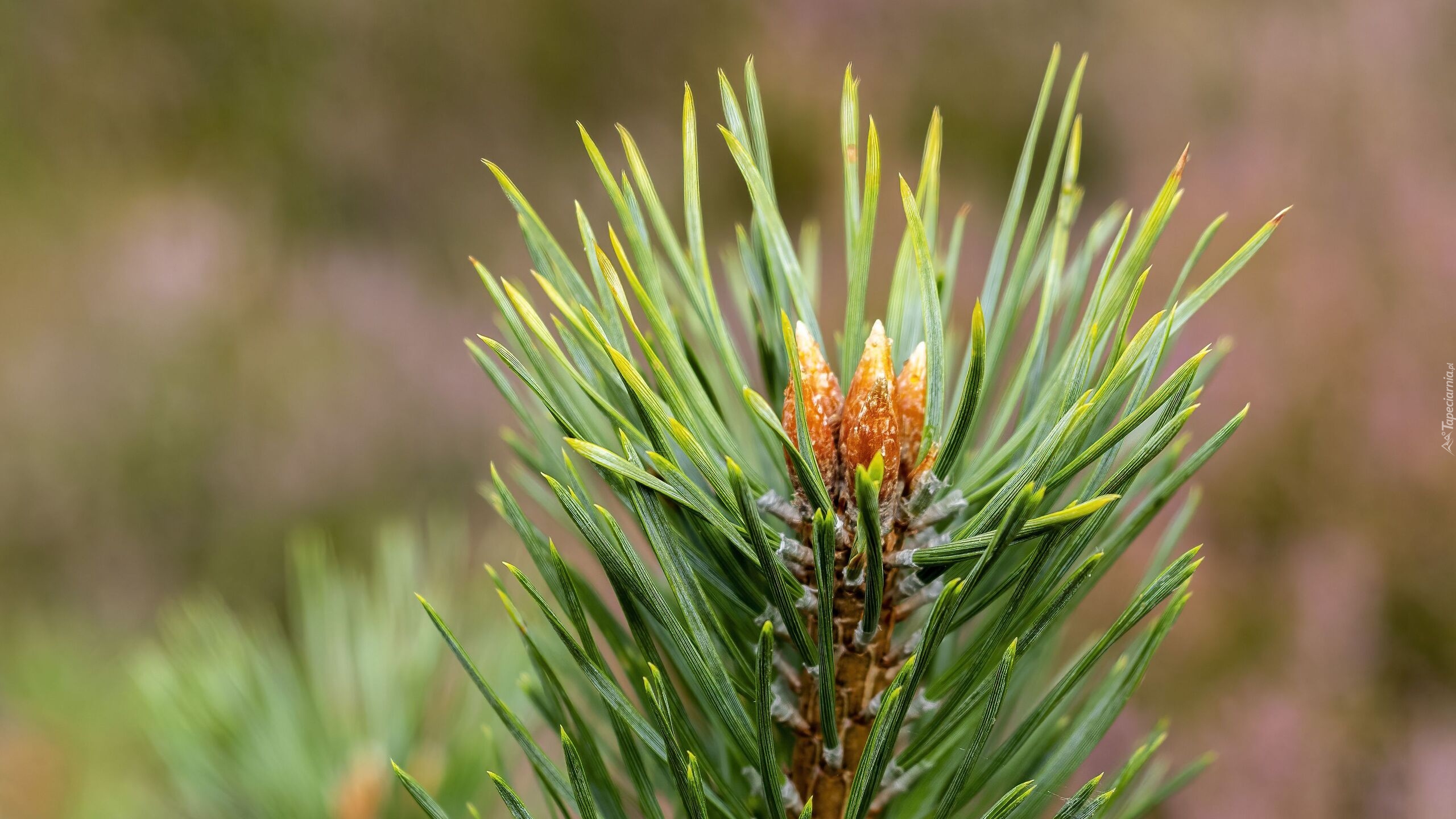 Edytor tapety: Czubek gałązki sosnowej na rozmytym tle