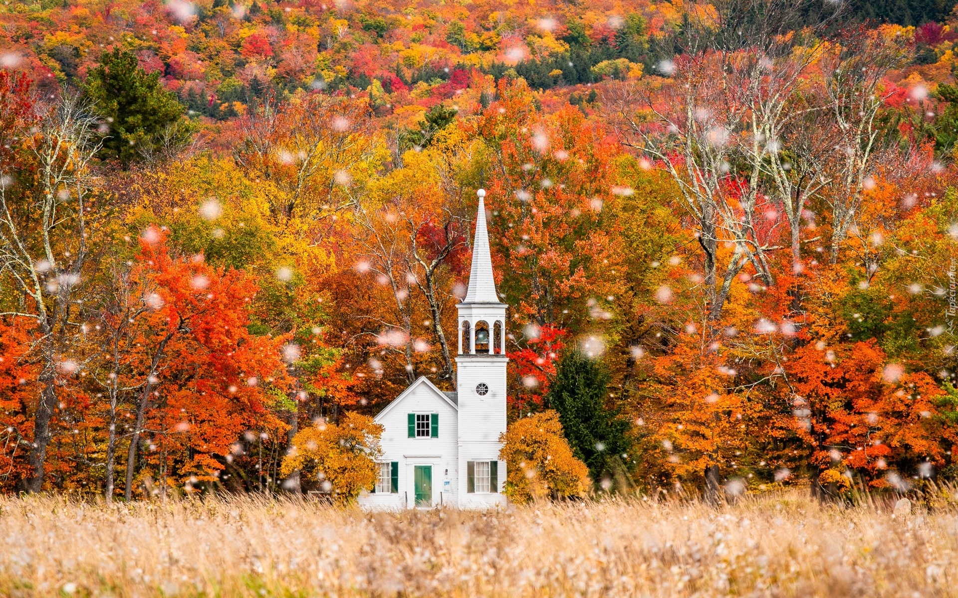 Edytor tapety: Kościół na łące pod jesiennym lasem