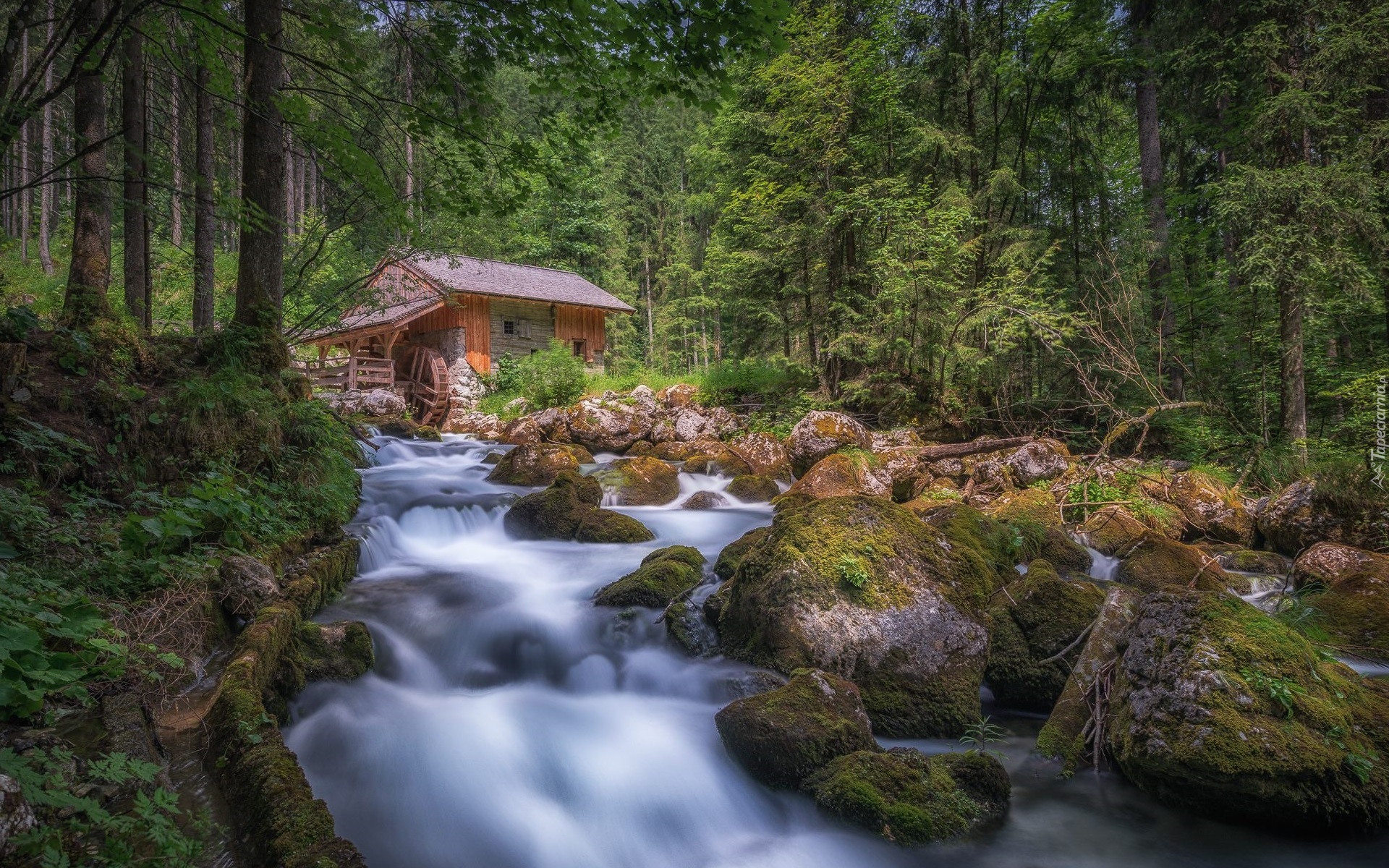 Edytor tapety: Młyn wodny w lesie nad rwącą rzeką
