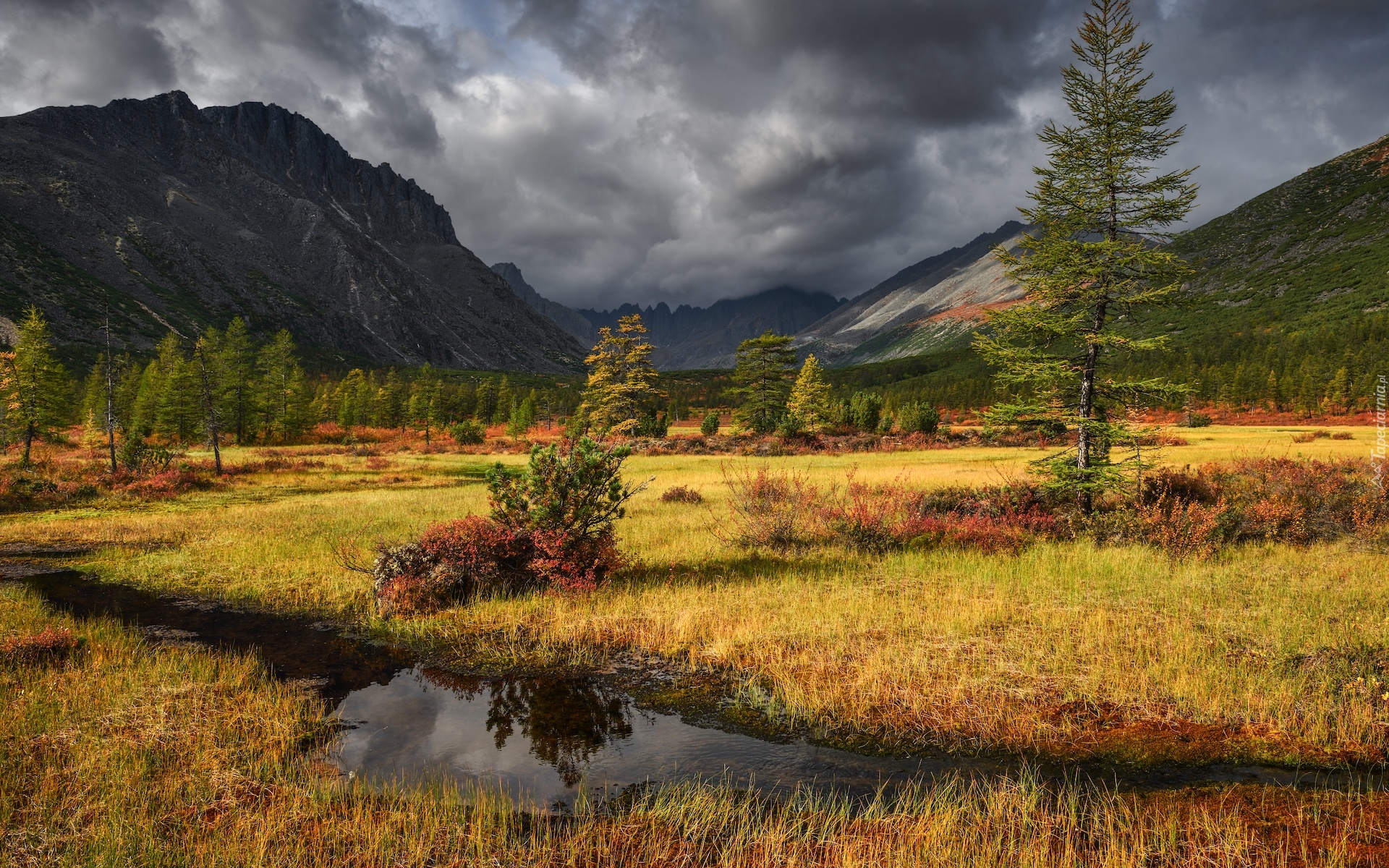 Edytor tapety: Rozświetlona trawa i ciemne chmury nad górami