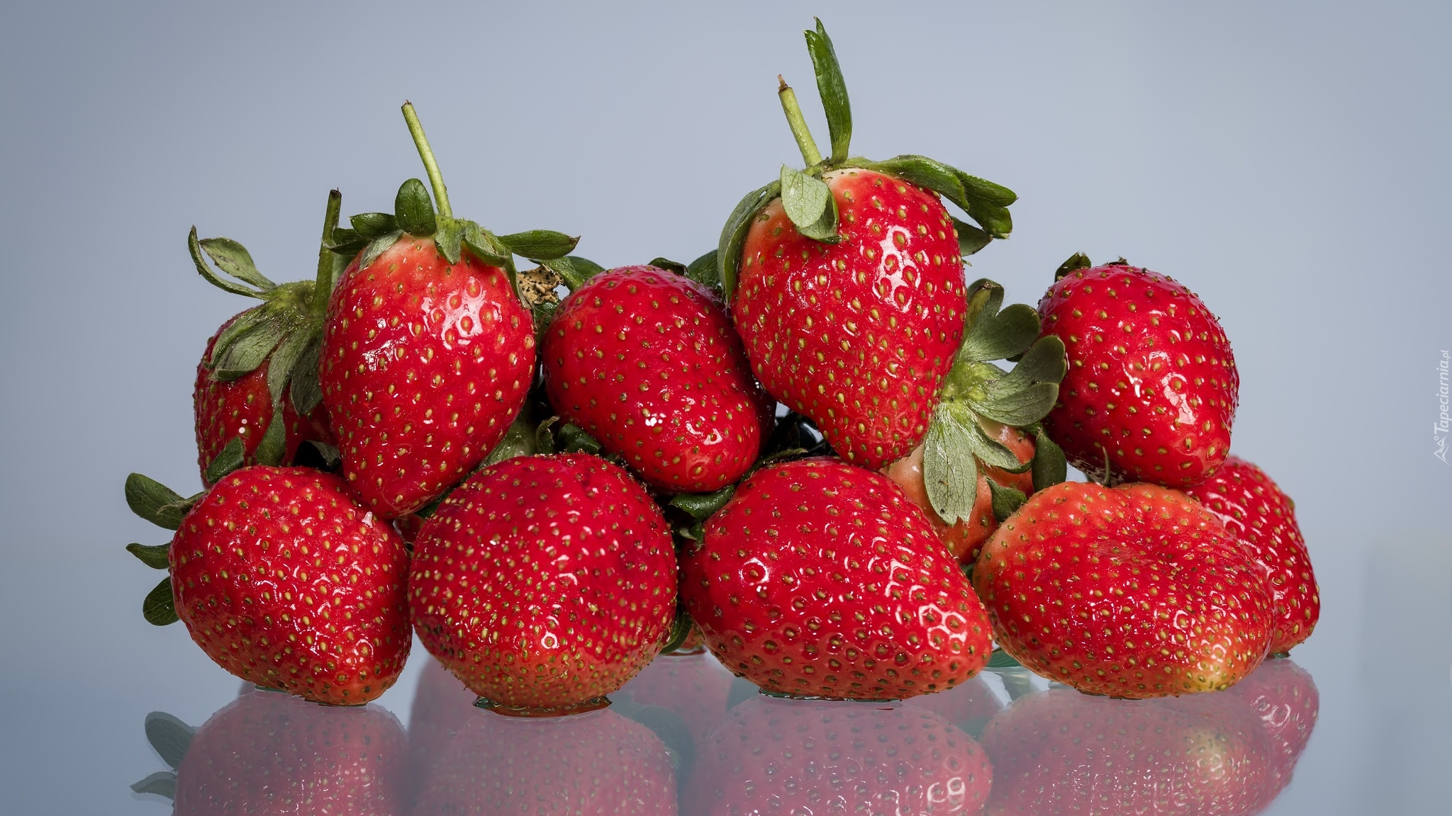 Edytor tapety: Odbicie na szkle czerwonych truskawek