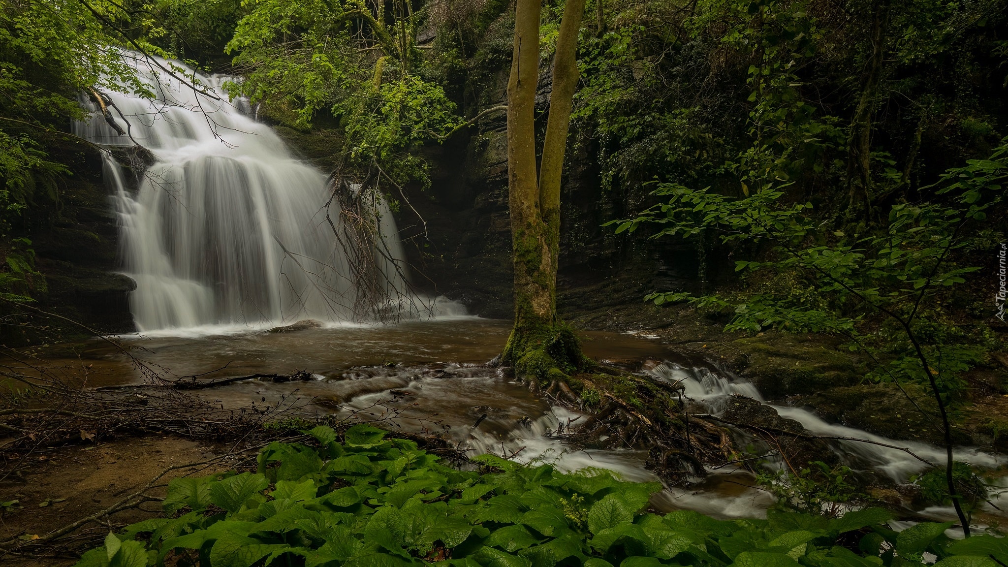 Edytor tapety: Zielone drzewa i wodospad na skałach