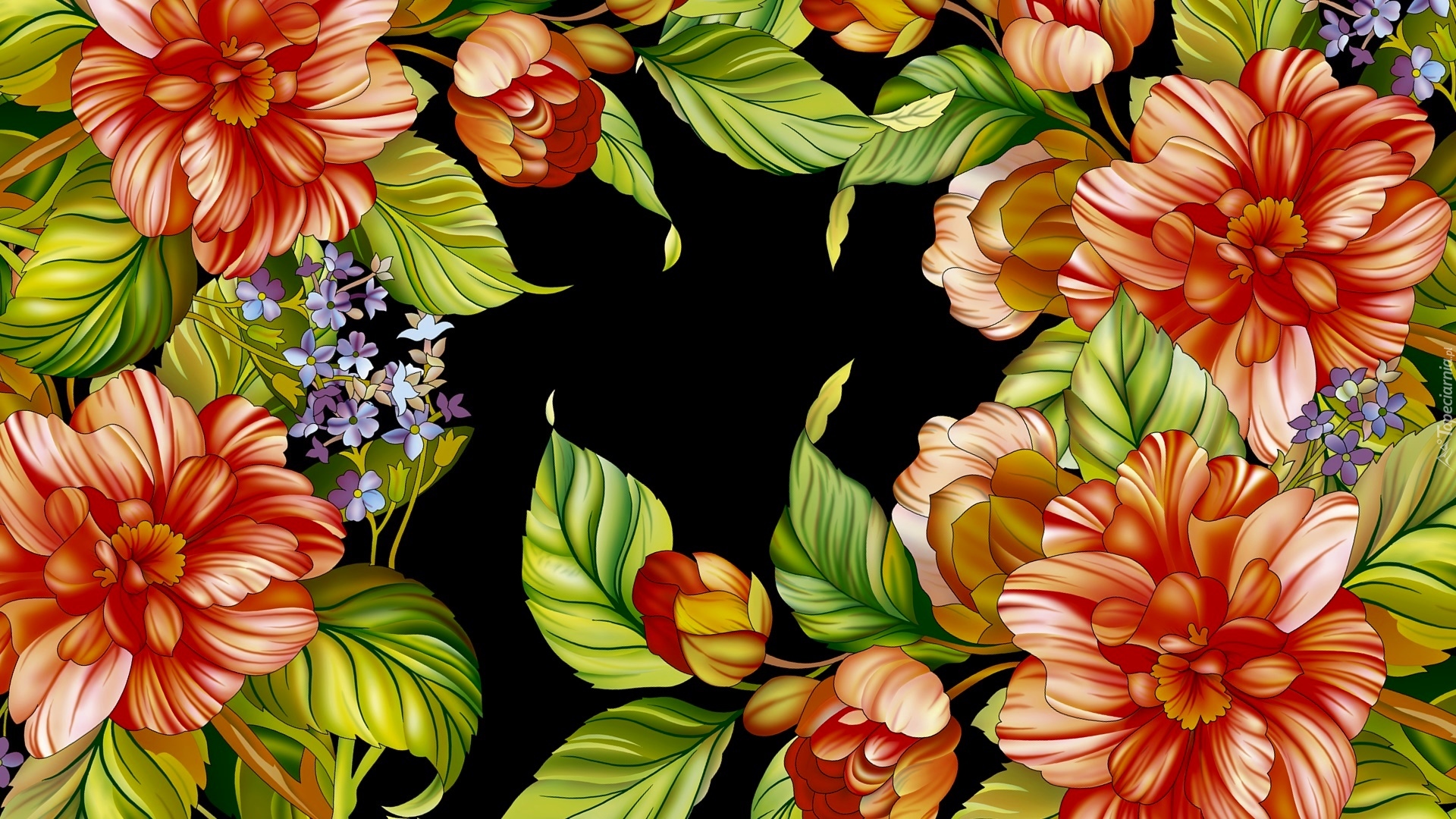 Edytor tapety: Kwiaty i liście w grafice na czarnym tle