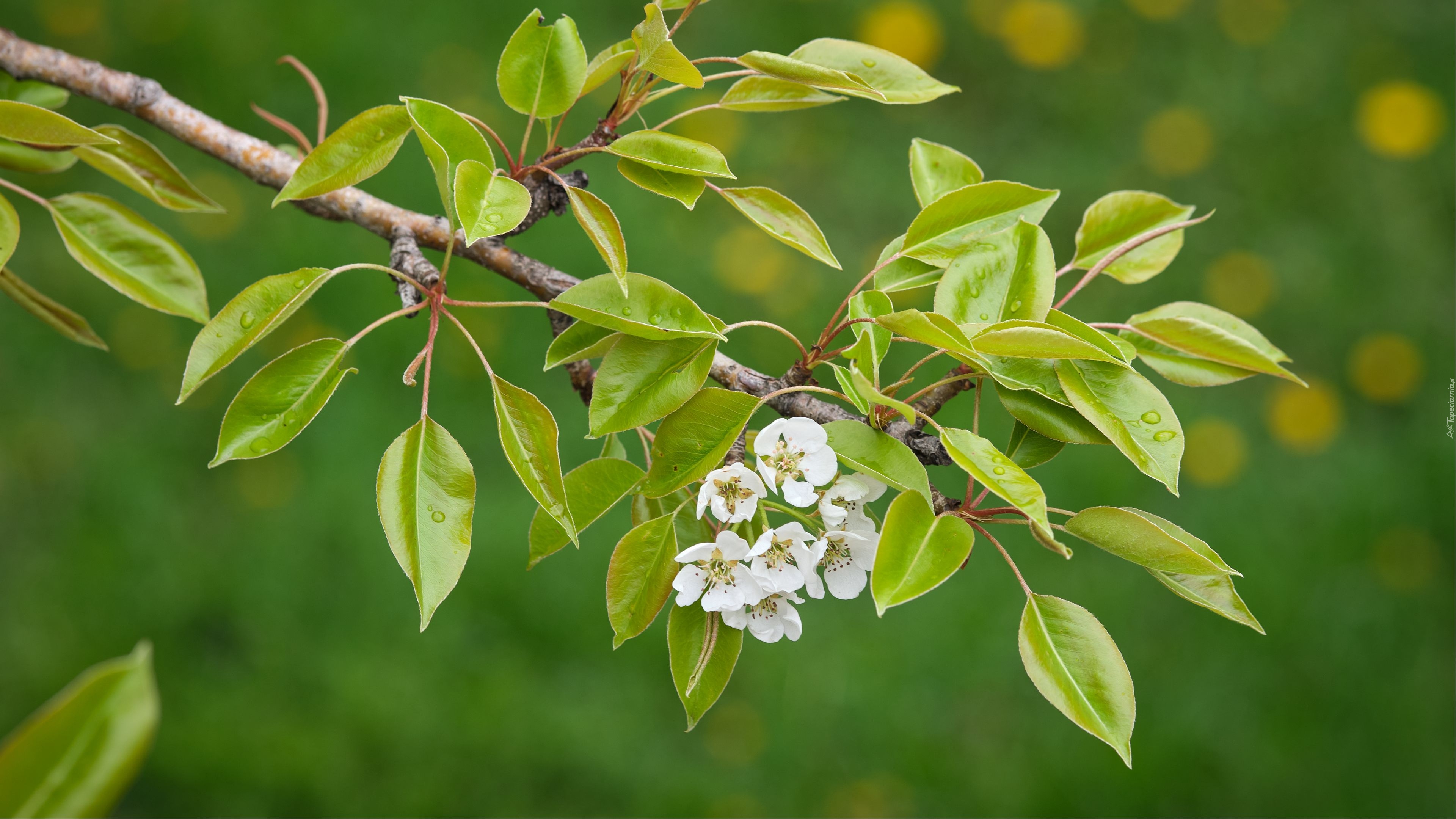 Edytor tapety: Gałązka z białymi kwiatkami na rozmytym tle