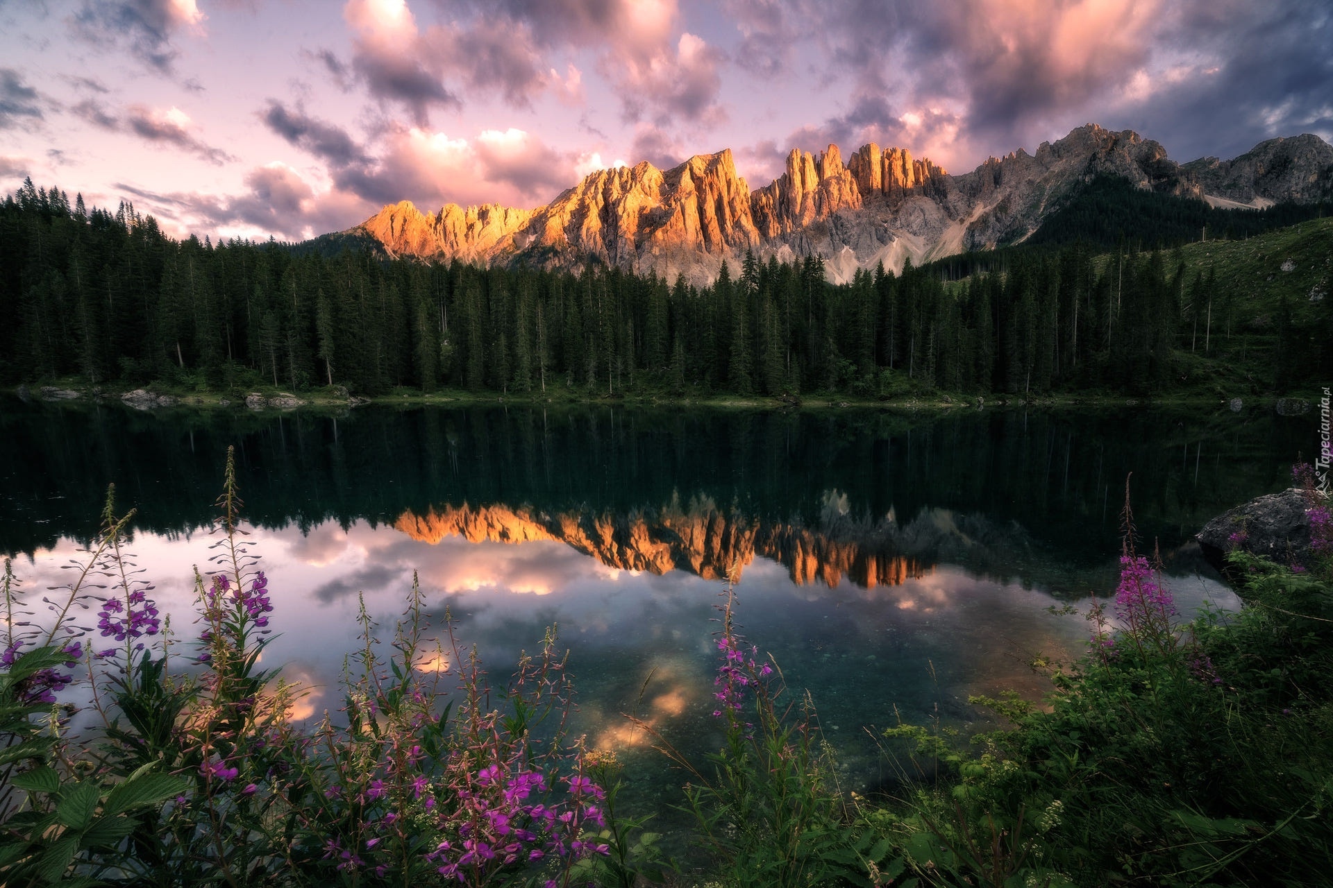 Edytor tapety: Kwiaty na brzegu jeziora w oddali góry
