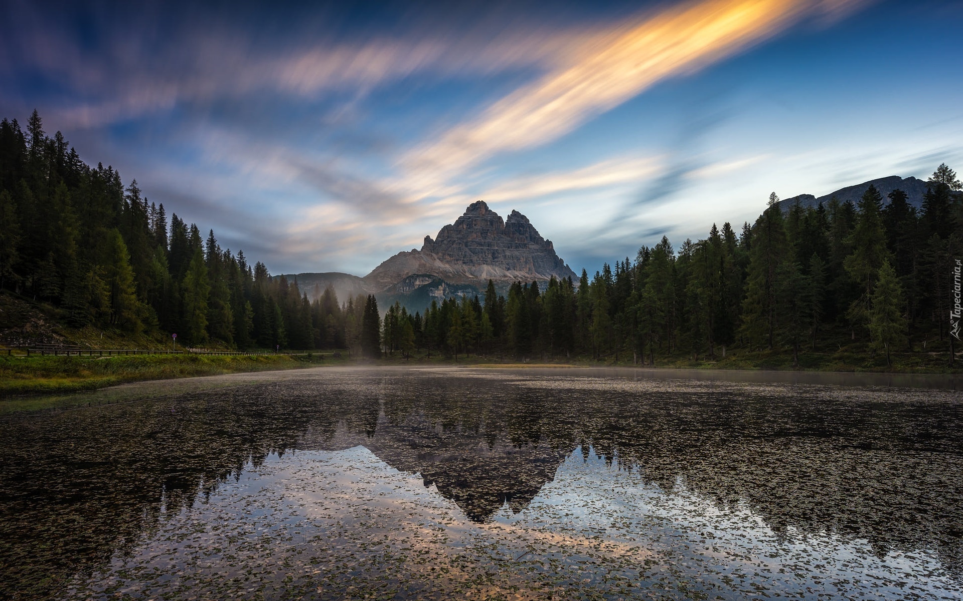 Edytor tapety: Odbicie Dolomitów i drzew w jeziorze Lake Antorno