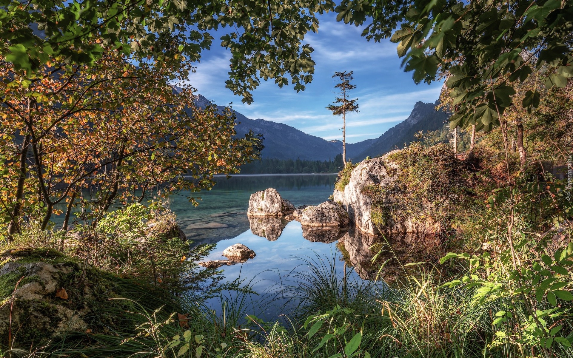 Edytor tapety: Drzewa na skałach nad górskim jeziorem Hintersee