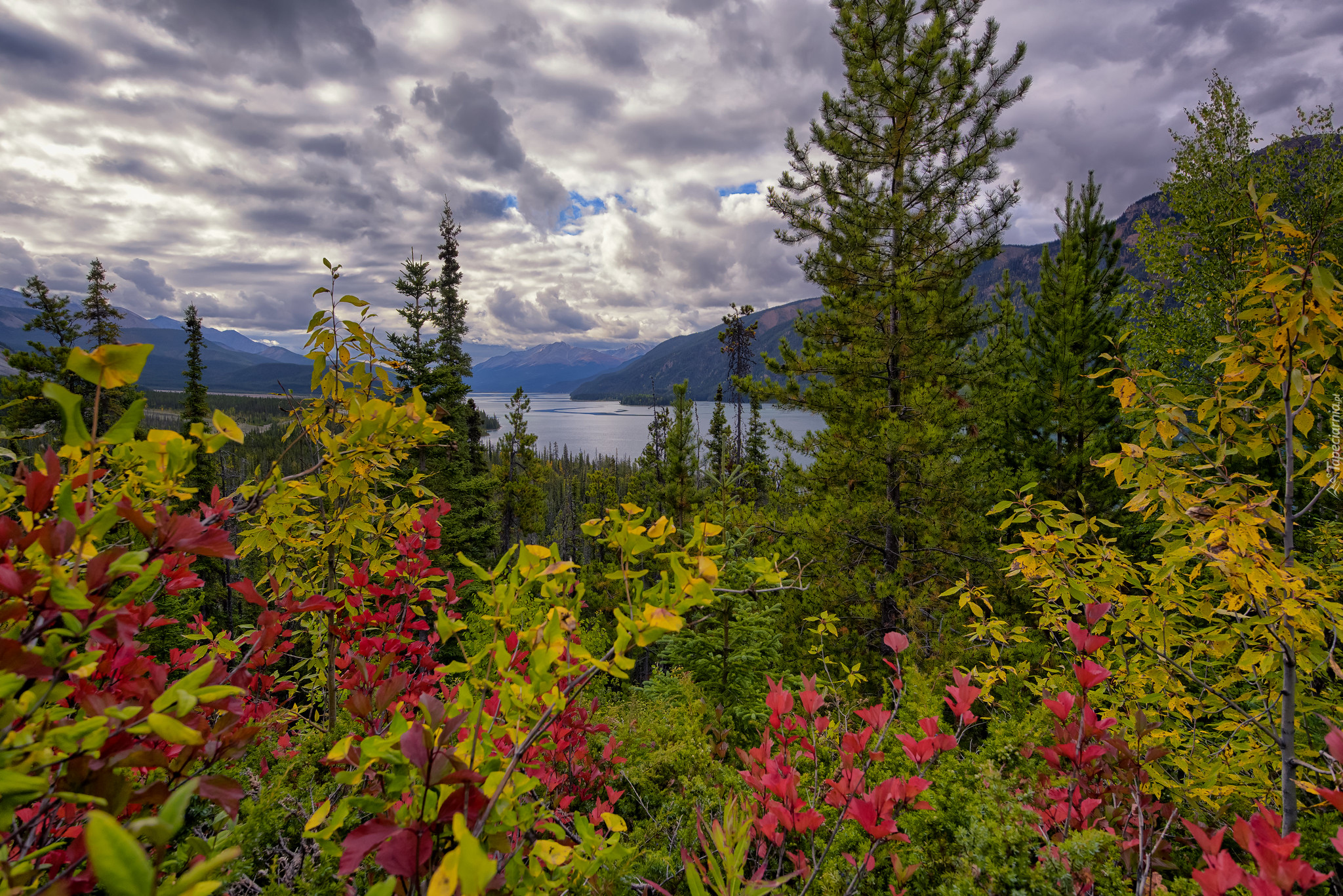 Edytor tapety: Drzewa zasłaniające jezioro Muncho Lake w Kanadzie