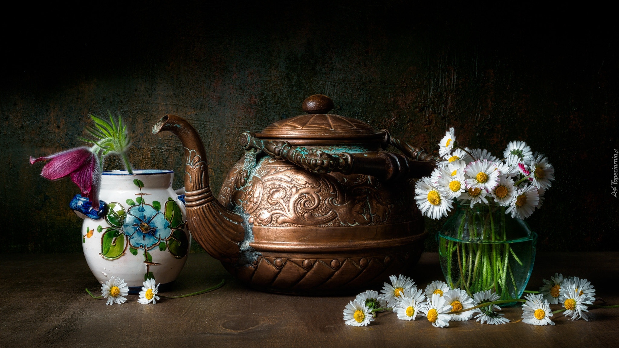Edytor tapety: Stokrotki w wazoniku obok czajnika