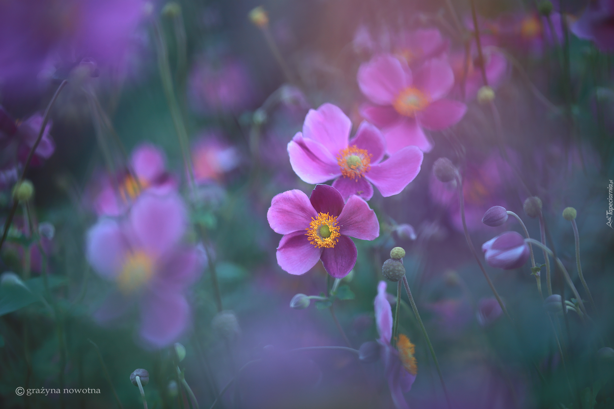 Edytor tapety: Rozmyte tło i fioletowe zawilce z pąkami