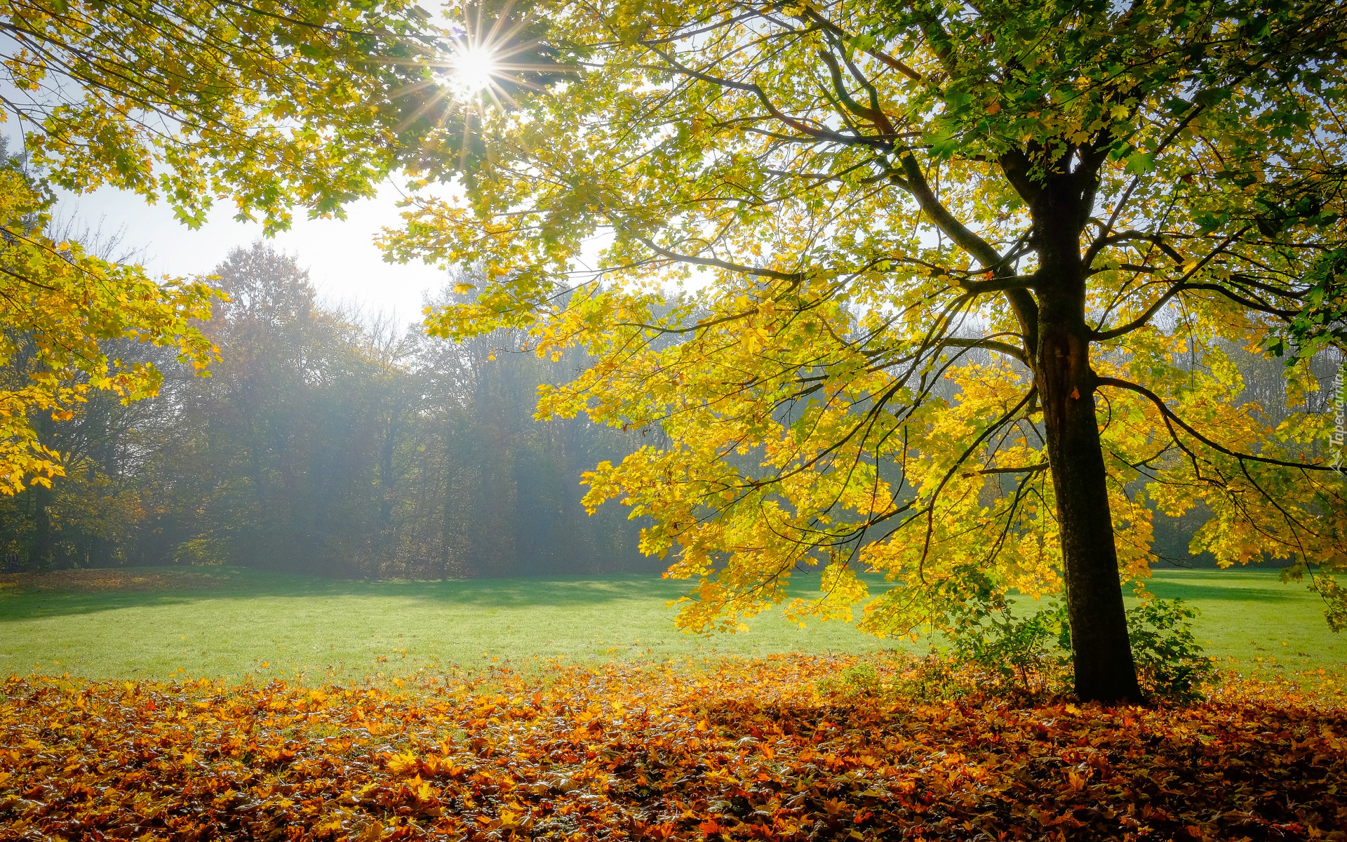 Edytor tapety: Rozświetlona promieniami słońca polana i drzewa jesienią