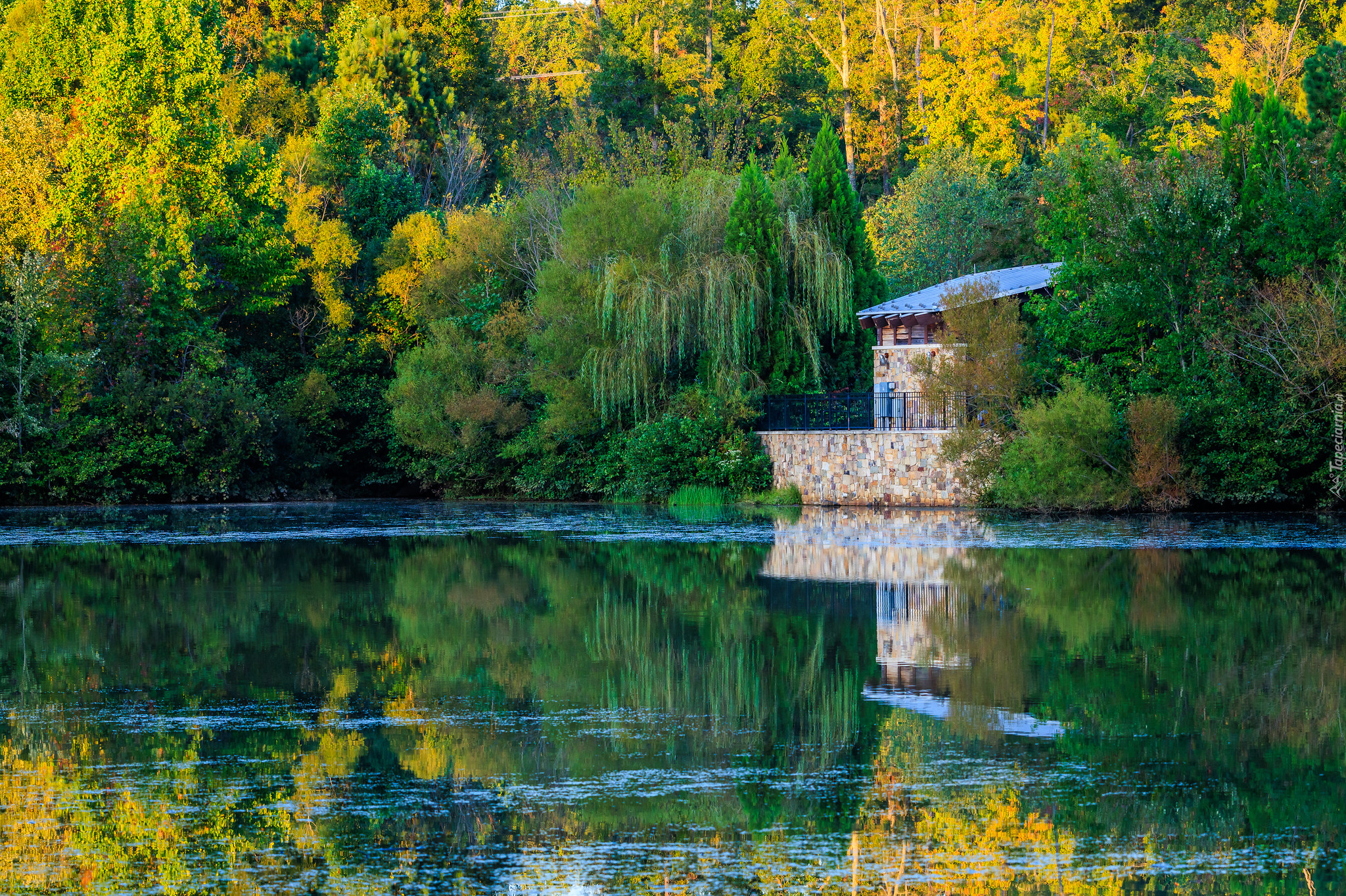 Edytor tapety: Domek pod jesiennymi drzewami nad stawem