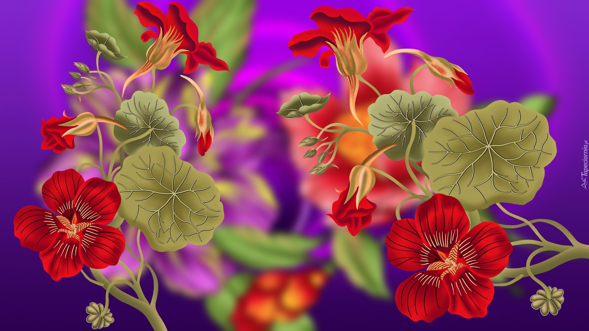Edytor tapety: Czerwone kwiaty na gałązkach w grafice