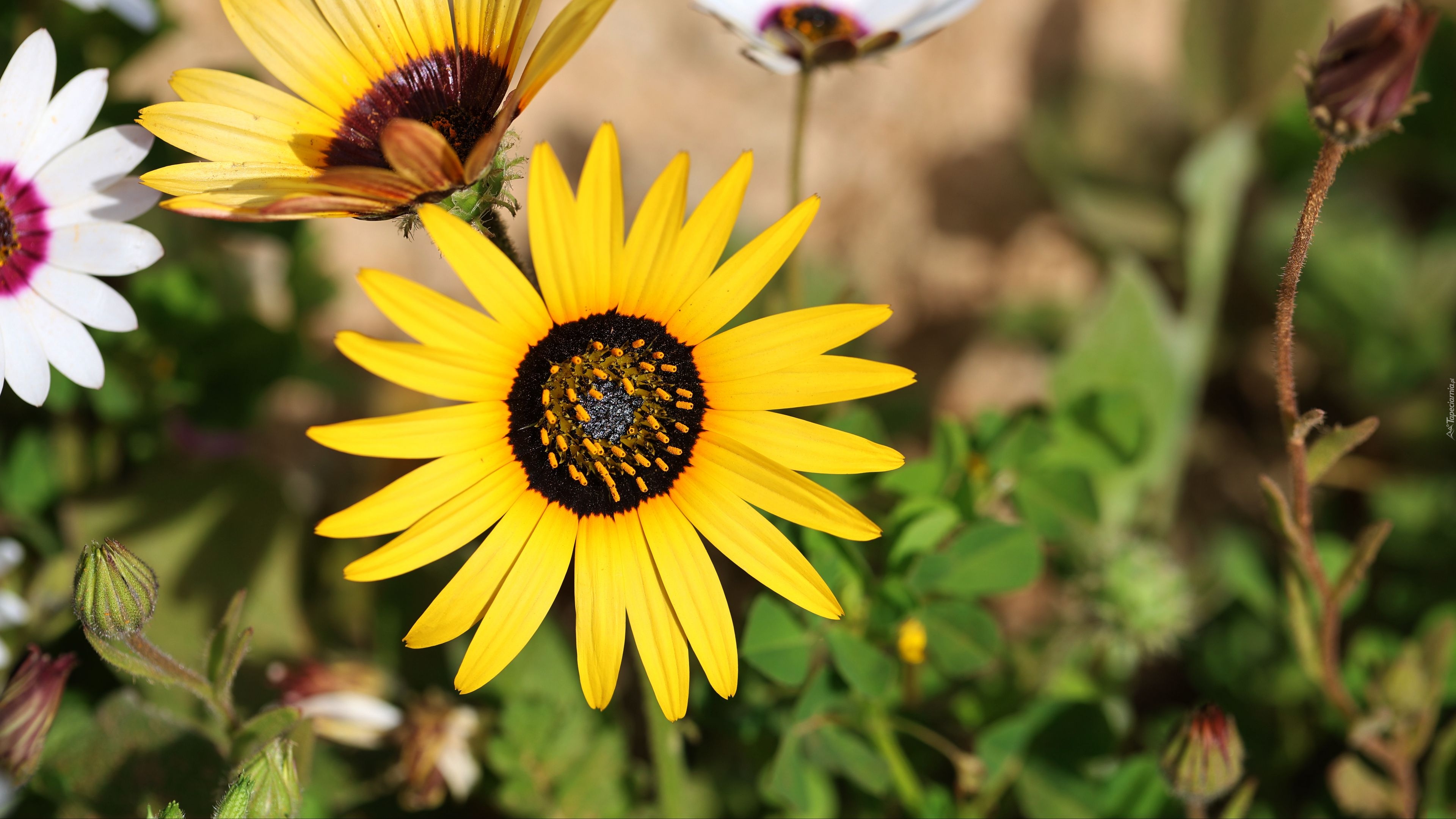 Edytor tapety: Żółte kwiaty z pąkami na rozmytym tle