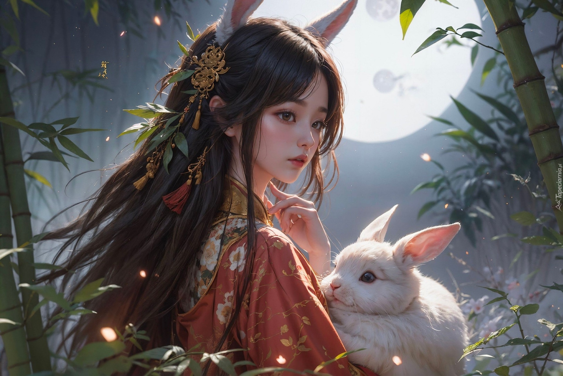 Edytor tapety: Długowłosa dziewczyna z królikiem w grafice