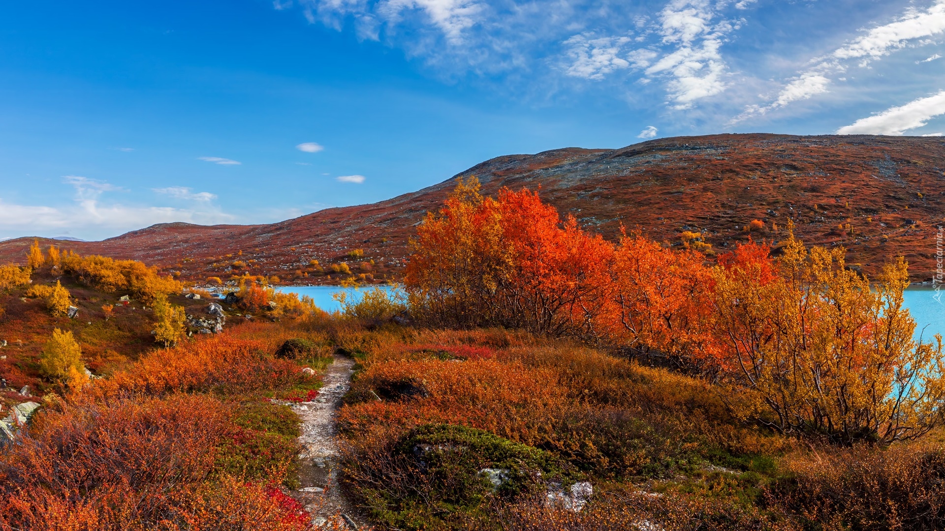 Edytor tapety: Kolorowe krzewy nad rzeką na tle gór