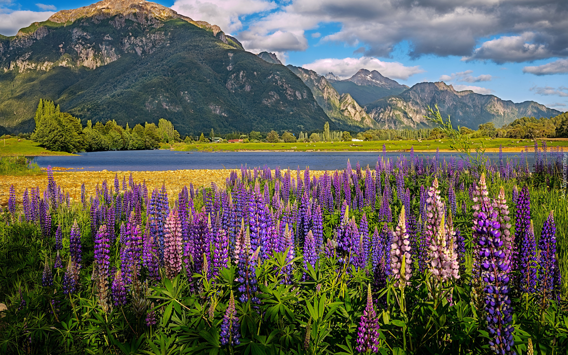Edytor tapety: Kwitnący łubin na zielonej polanie w górach